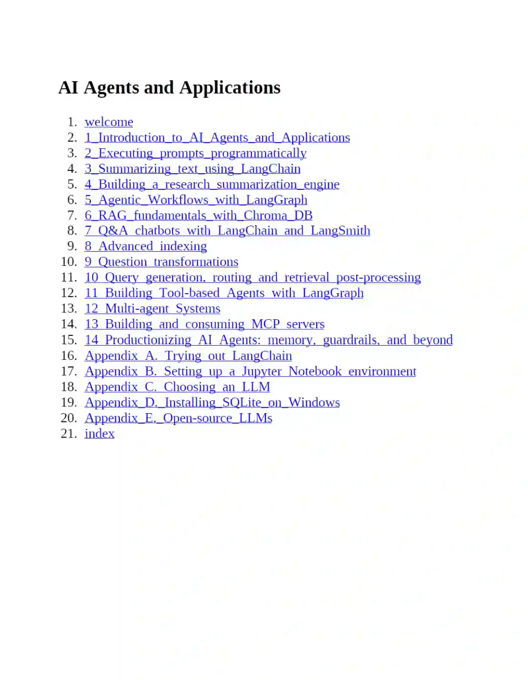 《AI Agents and Applications》 是你开发前沿语言模型解决方案、满足真实业务需求的实践指南。通过 LangChain 和 LangGraph,你将学习如何编排强大的智能体工作流,并构建能够在复杂环境中进行搜索、总结和执行操作的动态工具型智能体。本书将带你从提示工程这一基础技能出发,逐步深入到高级的 检索增强生成(RAG) 技术,直至部署能够利用最新 AI 集成技术(包括 MCP)的多智能体系统。 在 《AI Agents and Applications: With LangChain, LangGraph, and MCP》 中,你将学习到: * 面向自动化系统的提示与上下文工程,确保输出准确、无幻觉 * 用于文档总结、语义搜索和健壮问答机器人的高级 RAG 方法 * 借助 LangGraph 编排结构化、多步骤流程的智能体工作流 * 能够实时动态适应用户需求的工具型智能体 * 面向复杂真实任务的多智能体系统 * 集成 MCP 以实现工具的暴露、组合与即插即用式调用