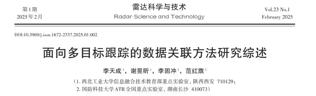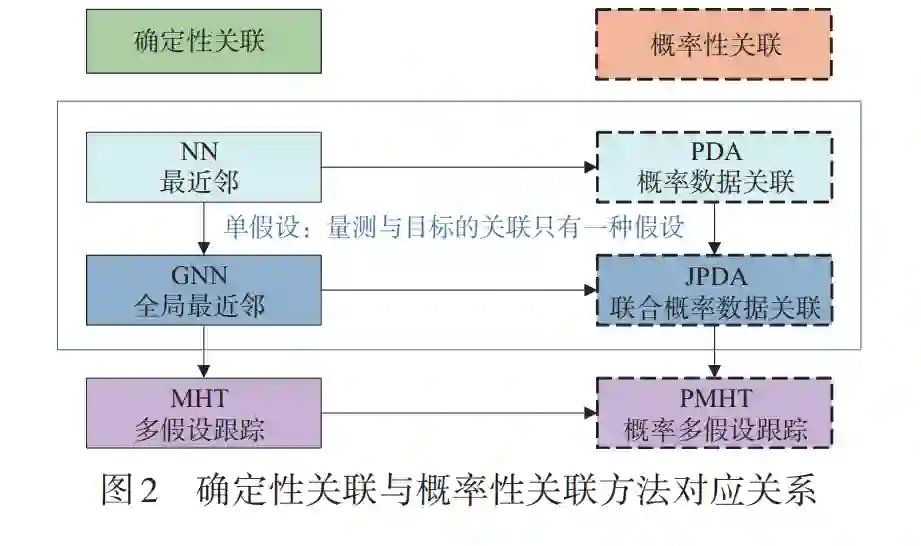 目标跟踪广泛应用于要地防御、防空反导和无人驾驶等军事和民用领域。相比单目标跟踪,多目标跟踪往往涉及到未知数目的多个目标以及杂波、漏检等复杂情况,所面临的一个技术难点是数据关联,包括量测与目标航迹之间的关联以及不同传感器之间航迹关联等。本文梳理了多目标跟踪应用中数据关联主要的解决思路,首次将经典数据关联方法分为确定性数据关联和概率性数据关联,前者包括最近邻、全局最近邻和多假设跟踪,后者包括概率数据关联、联合概率数据关联和概率多假设跟踪,系统阐述和对比了这些典型算法及其扩展方法的基本原理、各自适用条件和优缺点,给出它们之间的关联性,并指出近年来智能学习、优化算法等也为数据关联问题提供了新的解决思路。特别是在视觉跟踪领域,关联跟踪与目标特征学习、场景感知密切结合,给数据关联带来了新的挑战。本文对上述各类方法和思路进行了分析和总结,并展望了未来发展趋势。关键词: 多目标跟踪 数据关联 确定性关联 概率性关联