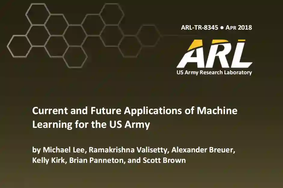 在这项工作中,我们回顾了机器学习的不同类别,并描述了一些更常用的方法。然后,我们指出了一小部分关于ML在ARL中的应用的例子。最后,我们预测了ML在未来可以应用于军队的各个领域,并概述了为实现这一结果需要解决的一些挑战。我们希望这份文件能够激励未来的研究人员和决策者继续投资于研究和开发,以充分利用ML来帮助推动美国陆军的发展。