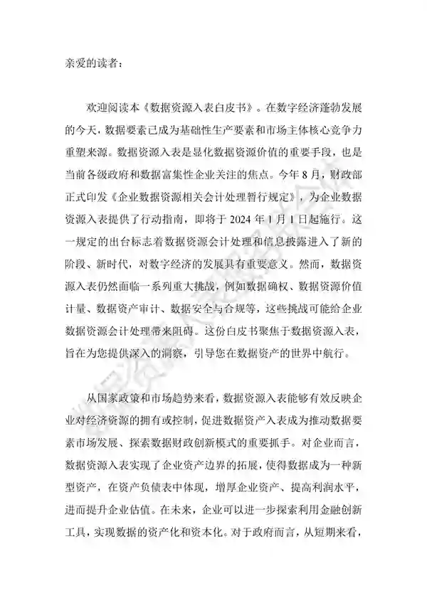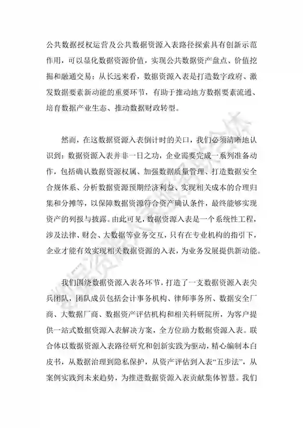来源:数据资源入表服务联合体 2022年12月2日,中共中央、国务院印发《关于构建数据基础制度更好发挥数据要素作用的意见》(以下简称“《数据二十条》”),指出要充分发挥海量数据规模和丰富应用场景优势,同时明确提出探索数据资产入表新模式。 2023年8月,财政部正式印发《企业数据资源相关会计处理暂行规定》,为企业数据资源入表提供了行动指南,即将于2024年1月1日起实行。这一规定的出台标志着数据资源会计处理和信息披露进入了新的阶段、新时代,对数字经济的发展具有重要意义。 数据资源入表意味着企业可以将数据资源确认为企业资产负债表中“资产”一项,对于拥有丰富数据资源的企业有望在财务报表中体现其真实价值和业务贡献,进而提升企业财务报表质量。与此同时,数据资源入表在盘活数据资源价值的同时,也有利于展示企业的数字竞争优势,为企业依据数据资源开展投融资等业务提供依据。 市场分析人士认为,数据资源入表作为一项系统性工程,涉及法律、财会、大数据等多业务交互,只有在专业机构的指引下,企业才能有效实现相关数据资源的入表,为业务发展提供新动能。 近日,数据资源入表服务联合体发布了全国首个《数据资源入表白皮书》,从数据治理到隐私保护,从资产评估到入表“五步法”,从案例实践到未来趋势,加快推广数据资源入表业务。白皮书共同编写的联合体单位有:北京中企华资产评估有限责任公司、清华大学技术创新研究中心、普华永道中国、北京大成律师事务所、中电网络安全科技股份有限公司以及深圳数据交易所等多家机构。 白皮书围绕数据资产评估及入表的全过程,借鉴了数据资源入表“五步法”,重点从数据合规与确权、数据治理体系、预期经济利益可行性分析、相关成本的合理归集与分摊、列报与披露和安全监管保障体系等环节,分析了数据资源入表的技术路线。根据上述思路,我们建议通过组建生态联盟的方式,发挥各家所长,为企业提供一站式、专业化的数据资源入表服务。 具体职责划分如下: 大数据厂商主要围绕数据全生命周期管理,主要能力将聚焦数据存储、治理、登记确权及质量评价等全流程核心工作; 数据资产评估机构将会从专业角度出具价值评估报告,结合大数据厂商出具的数据质量评价结论形成完整的数据资产评估报告提供咨询服务; 律师事务所通过从数据权属和法律属性进行数据合规审查,制定数据合规评估指南; 数据安全厂商将从安全监管角度助力数据资产安全性评估,明确提出数据安全管理和隐私保护要求,按照“不安全不核算”的原则开展安全评估,严守数据安全底线; 会计事务机构将从财务角度进行入表核查,厘清数据资产确认的条件和方式,划定数据资产边界,明确数据资产的会计核算范围,从财务核算以及价值计量角度,帮助企业进行数据资源入表就绪程度能力评估-价值计量与列报披露能力评估,以及提供初始计量、后续计量,列报披露以及案例实证四个模块的全生命周期价值计量模型。 具体内容如下: