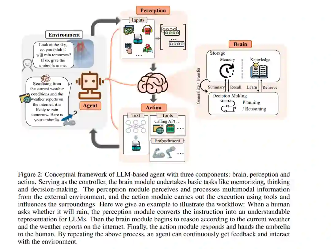 **12、AI Agent下一个热点?复旦最新86页《大型语言模型智能体的崛起与潜力》综述,详述LLM Agent: 大脑、感知和行动**https://www.zhuanzhi.ai/paper/cd77bba118be3a41aa389b99437d8988 长期以来,人类一直在追求与人类水平相当或超越的人工智能(AI),认为AI智能体是实现这一目标的有前景的工具。AI智能体是能感知环境、做出决策并采取行动的人造实体。自20世纪中叶以来,已经做出了许多努力以发展智能的AI智能体。然而,这些努力主要集中在算法或训练策略的进步上,以提高在特定任务上的特定能力或性能。实际上,这个领域缺乏的是一个足够通用和强大的模型,作为设计能适应多样化场景的AI智能体的起点。由于它们展示出的多功能和出色的能力,大型语言模型(LLMs)被认为是通用人工智能(AGI)的潜在媒介,为构建通用AI智能体提供了希望。许多研究努力已经以LLMs为基础来构建AI智能体,并取得了显著进展。我们首先从其哲学起源追溯智能体的概念,到其在AI中的发展,并解释为什么LLMs是适合作为AI智能体的基础。在此基础上,我们提出了一个基于LLM的智能体的概念框架,包括三个主要组成部分:大脑、感知和行动,该框架可以根据不同的应用进行定制。随后,我们探讨了基于LLM的智能体在三个方面的广泛应用:单智能体场景、多智能体场景和人-智能体合作。接下来,我们深入研究智能体社会,探讨基于LLM的智能体的行为和个性,当它们形成社会时出现的社会现象,以及它们为人类社会提供的洞见。最后,我们讨论该领域内的一系列关键主题和未解决的问题。