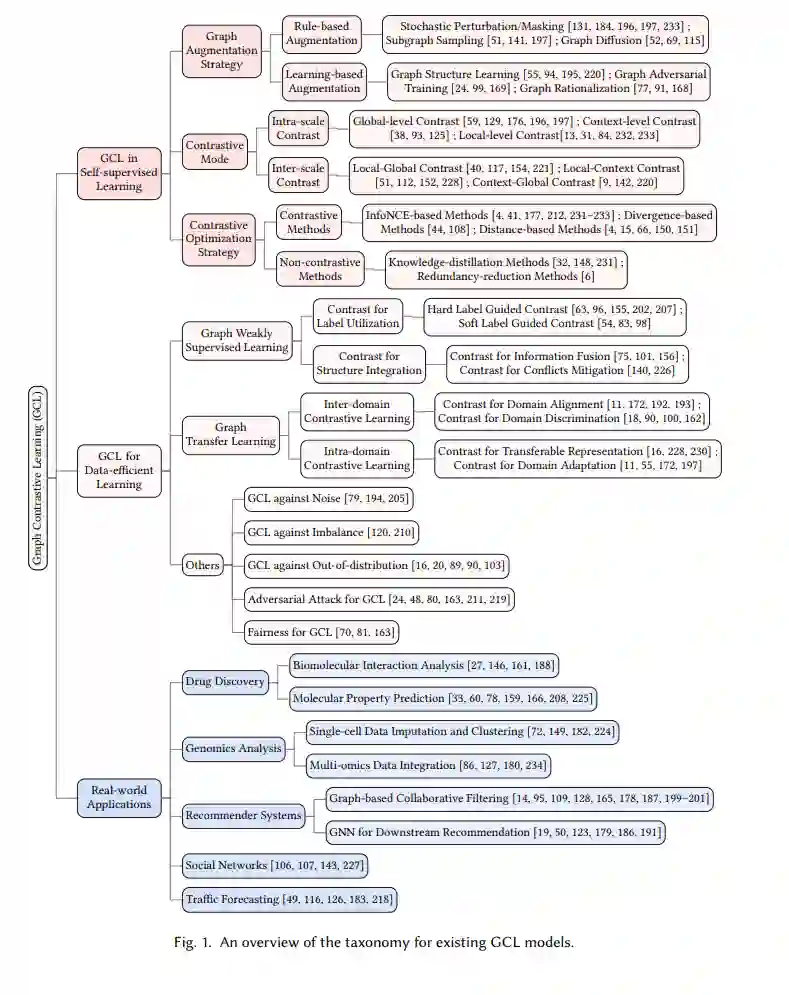 尽管现有文献综述对图自监督学习范式提供了全面覆盖,但它们往往缺乏对具体方面的深入分析。这种不足可能源于该领域的广泛范围和同时开发的多种技术。例如,图对比学习(Graph Contrastive Learning, GCL)目前是研究最广泛的范式之一。然而,现有的图自监督学习文献通常只涵盖了GCL的基本原理,而没有充分探索其在各种情境和下游应用中的潜力。 为此,在本综述中,我们的主要关注点是提供对GCL的全面概述。重要的是,据我们所知,目前尚无专门研究GCL的专题综述。本文的整体结构如图1所示。技术上,我们首先总结了GCL在自监督学习中的基本原理,包括增强策略、对比模式和对比优化目标。随后,我们探讨了GCL在其他数据高效学习方面的扩展,如弱监督学习、迁移学习和其他相关情境。此外,我们讨论了GCL的实际应用,并概述了该领域的挑战和未来可能的发展方向。本综述的核心贡献可以总结如下:
