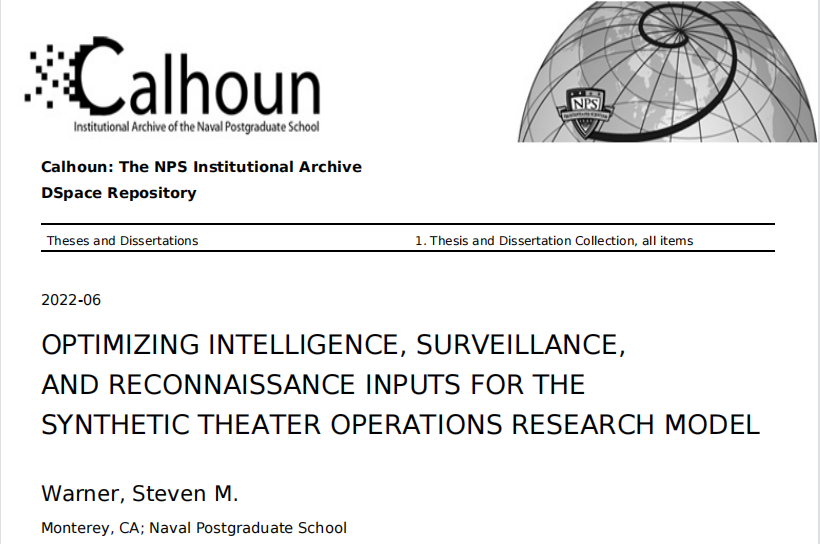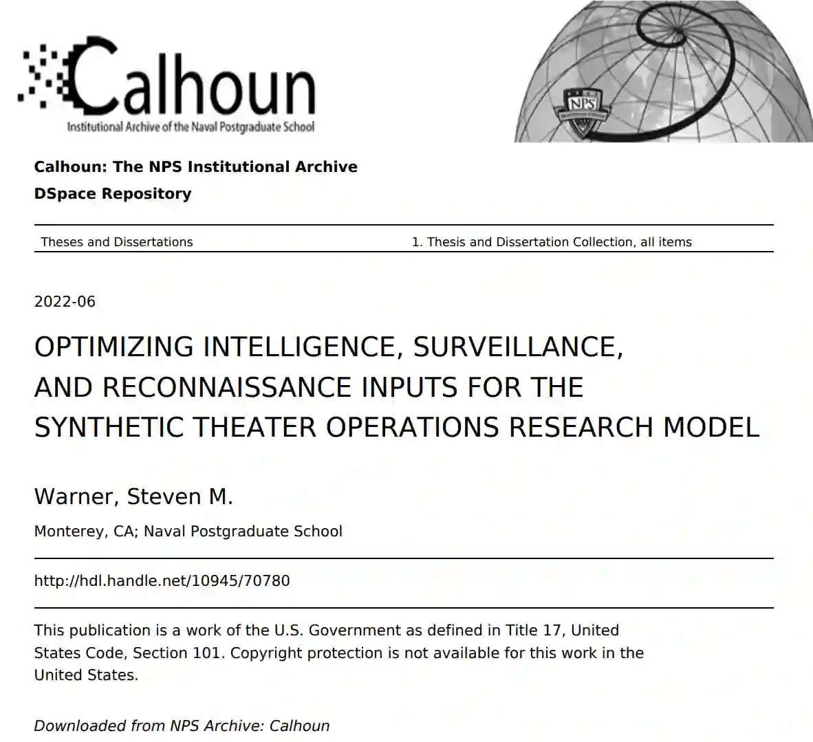 在这篇论文中,我们制定了一个新颖的、大规模的、混合整数的优化模型,以超越STORM的启发式搜索ISR的表现。该模型被称为SOM,使用间隙指数对自上次查看每个网格单元以来的扫描次数进行惩罚。我们希望避免收集这些惩罚,这促使我们重新访问网格单元。目标函数最小化了这种产生间隙的惩罚。我们使用几个约束条件来维护、重置和跟踪间隙计数器,一个访问所有网格单元的软约束条件,以及一个对网格单元施加最小分辨率的约束条件。SOM的一个独特的特点是它是事件驱动的,在战斗空间上掠过,不以时间为基础。SOM使用实际的STORM数据,有1300多行代码,包括在R中收集数据,在Pyomo中处理和实现模型。