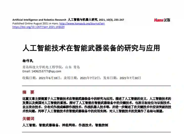 这篇文章主要侧重于人工智能技术在智能武器装备中的研究与应用。描述了人工智能的定义,人工智能技术的发展以及美国对人工智能的重视。探讨了人工智能在智能武器装备中的关键技术,包括目标定位与识别技术、自主攻击技术、分布式作战或蜂群作战技术、作战机器人技术等,并进一步阐述了在关键技术中应该突破的技术性问题。列举了人工智能技术在智能武器装备中的应用实例,对人工智能技术的发展作了总结与展望。