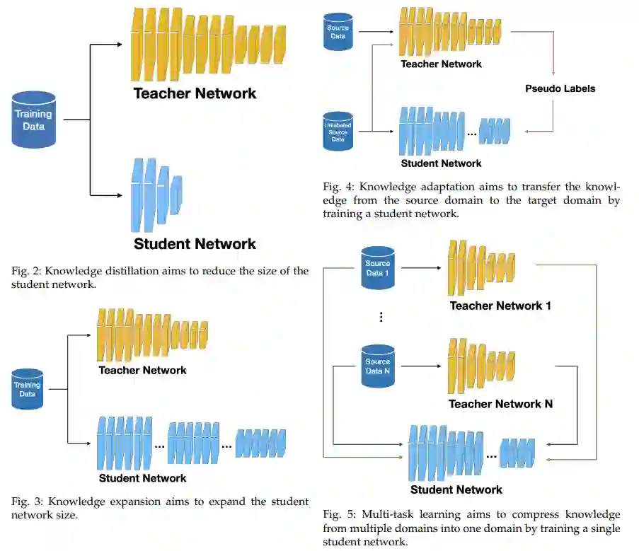 与现有的知识蒸馏综述不同,我们介绍了针对多个知识学习目标的师生架构,包括知识蒸馏、知识扩展、知识适应和多任务学习。