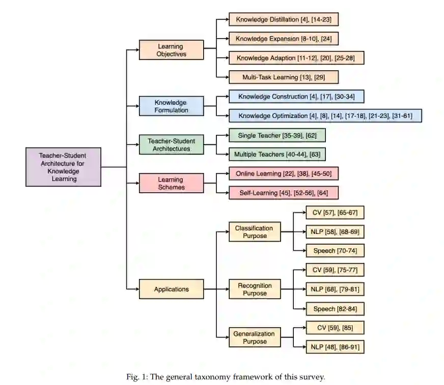 因此,本综述提供了一个全面和深刻的指南,关于知识学习的师生架构。不同于现有的知识蒸馏[5]、[6]、[7]的综述,本文首先介绍了针对多个知识学习目标(包括知识蒸馏、知识扩展、知识适应和多任务学习)的师生架构,然后讨论了知识构建和优化过程。此外,我们系统地总结了各种师生体系结构和学习方案,可用于学习具有代表性和鲁棒性的知识。本文还从分类、识别和生成等不同目的的角度讨论了师生体系结构的最新应用。最后,分别从师生架构设计、知识质量和基于回归学习的理论研究三个方面探讨了知识学习的潜在研究方向。本次综述的总体分类框架如图1所示。这项综述的主要贡献可以总结如下。