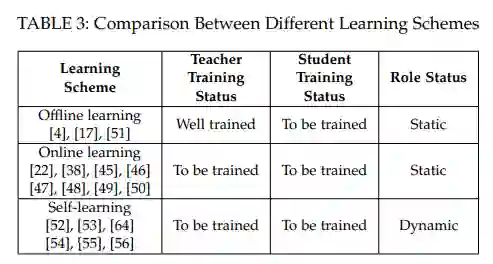 5 学习方案****5.1在线学习表3从教师和学生的学习状态以及各自的角色状态对不同的学习方案进行了比较。经典的学习方案是离线学习[4],它表示学生网络从预先训练好的教师网络中学习迁移的知识。具体来说,强大的教师网络首先在大规模数据集上得到完全良好的训练,然后将知识转移到指导紧凑学生网络的训练。在学生训练过程中,教师和学生网络的角色没有交换。需要注意的是,线下学习不包括在这份调查报告的范围内,我们建议读者参考现有的关于线下学习[5]、[7]的全面综述。