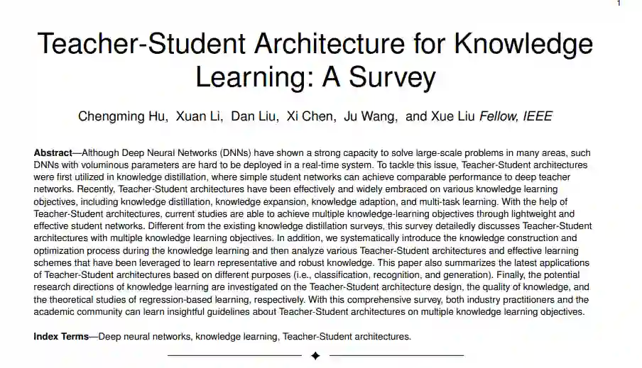 尽管深度神经网络(DNNs)在许多领域都表现出了强大的解决大规模问题的能力,但这种具有大量参数的DNNs很难部署在实时系统中。为了解决这个问题,教师-学生体系结构首先被用于知识蒸馏,其中简单的学生网络可以实现与深度教师网络相当的性能。近年来,师生体系结构在各种知识学习目标上得到了有效和广泛的应用,包括知识蒸馏、知识扩展、知识适应和多任务学习。在师生体系结构的帮助下,目前的研究能够通过轻量级和有效的学生网络实现多种知识学习目标。与现有的知识蒸馏综述不同,该综述详细讨论了具有多个知识学习目标的师生体系结构。此外,我们系统地介绍了知识学习过程中的知识构建和优化过程,然后分析了各种师生架构和有效的学习方案,以学习具有代表性和鲁棒性的知识。本文还总结了基于不同目的(即分类、识别和生成)的师生体系结构的最新应用。最后,分别从师生架构设计、知识质量和回归学习理论研究三个方面探讨了知识学习的潜在研究方向。通过这个全面的综述,行业从业者和学术界都可以了解到关于多个知识学习目标的师生架构的有见地的指导方针。 https://arxiv.org/abs/2210.17332