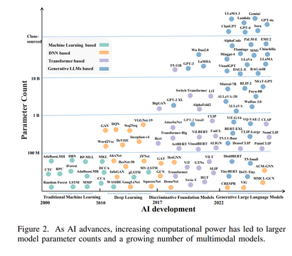 为了回顾MXAI的历史并预测其发展,我们首先将不同阶段进行分类,并从历史角度回顾了各种模型(如图2所示)。在传统机器学习时代(2000-2009年),有限的结构化数据的可用性促进了像决策树这样的可解释模型的出现。在深度学习时代(2010-2016年),随着大型标注数据集(如ImageNet [7])的出现以及计算能力的提升,复杂模型和可解释性研究崭露头角,包括神经网络核的可视化 [8]。在判别式基础模型时代(2017-2021年),Transformer模型的出现,利用大规模文本数据和自监督学习,彻底改变了自然语言处理(NLP)。这一转变引发了对注意力机制的解释研究 [1],[9]–[11]。在生成式大型语言模型时代(2022-2024年),大量多模态数据的集成推动了生成式大型语言模型(LLMs)的发展,如ChatGPT [3],以及多模态融合技术。这些进展提供了全面的解释,增强了模型的透明性和可信度。这一演变导致了对MXAI的关注,它解释了处理多样数据类型的模型 [6]。