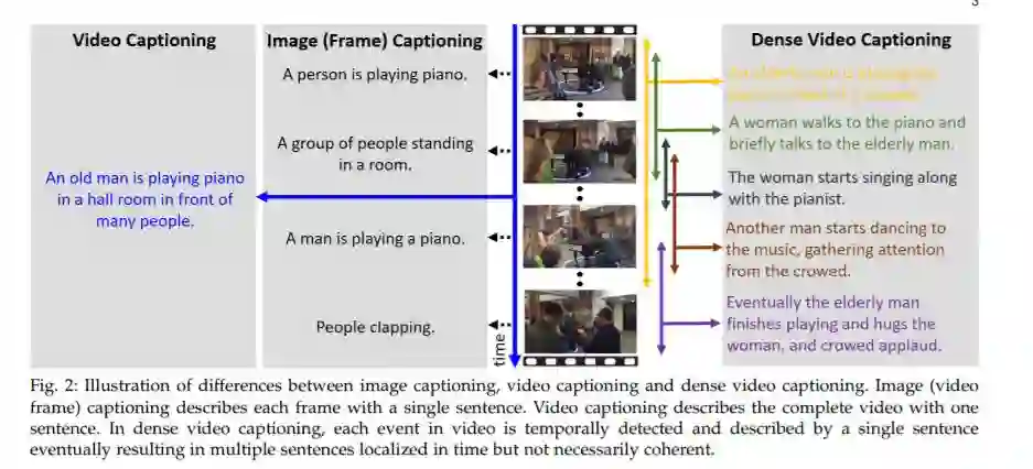视频描述是自动生成描述给定视频内容的自然语言句子。它广泛适用于人类机器交互,帮助视力受损和视频标题生成。由于计算机视觉和自然语言处理的深度学习取得了前所未有的成功,过去几年来该领域的研究大量增加。研究文献中提出了许多方法,数据集和评估指标,呼吁需要进行全面调研综述,以将研究工作集中在这一蓬勃发展的新方向上。本文通过调研最先进的方法填补了这一空白,重点是深度学习模型;比较基准数据集的域,类别数和存储库大小;并确定各种评估指标的优缺点,如SPICE,CIDEr,ROUGE,BLEU,METEOR和WMD。经典的视频描述方法将主题,对象和动词检测与基于模板的语言模型相结合以生成句子。然而,大型数据集的发布表明,这些方法无法应对无约束开放域视频的多样性。经典方法之后是一个非常短暂的统计方法时代,很快被深度学习所取代,深度学习是视频描述的现有技术。我们的调研显示,尽管发展速度很快,但由于以下原因,视频描述研究仍处于起步阶段。对视频描述模型的分析具有挑战性,因为难以确定最终描述中视觉特征和所采用的语言模型对准确性或错误的贡献。现有数据集既不包含足够的视觉多样性也不包含语言结构的复杂性。最后,当前的评估指标未能衡量机器生成的描述与人类描述之间的一致性。我们通过列出有希望的未来研究方向来结束我们的调研。
