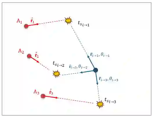 图. 潜在拦截特征示意图。呈现3名攻击方与1名防御方的交战场景。基于既定防御策略,防御方可从3种潜在拦截轨迹中择一执行。