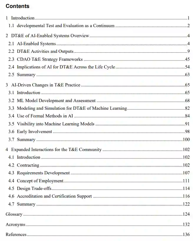 人工智能的引入对开发测试与评估(DT&E)带来重大变革。机器学习(ML)方法与负责任人工智能(RAI)要求改变了系统及软件生命周期的传统模式,包括性能特征化与风险管理。测试与评估(T&E)需贯穿AIES开发全周期,以确保评估有效性与可信度。这种全周期渗透通常要求DT&E深度参与科技研发(S&T)、原型开发与实验验证。 本指南初始版本阐释人工智能如何重塑DT&E,从DT&E活动与输出以及人工智能驱动变革因素的双重视角展开分析。手册涵盖机器学习数据集测试评估方法,包括数据集本身、基于其训练的模型及集成系统的评估。同时简要探讨T&E团队与其他实践社群加强互动可能带来的全局性效益——此类扩展性互动对DT&E团队早期介入系统作战概念(CONEMP)定义至关重要。