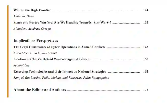世界各国政府不得不理解和适应,并提出适当的应对措施,以认识到战争性质的变化。本汇编旨在描述未来的战争可能形态,将在哪些不同的战场和领域进行战争,以及关键技术和新兴技术在帮助实现未来战争的目标方面的作用。本卷收录的文章由来自全球各地的专家作者撰写,涉及各种主题,包括自主武器和人工智能;网络武器;空间和反空间技术;生物技术和生物战;数据分析和行为科学;核武器的作用;量子技术;涉及空间、网络或核的不同领域或技术之间的相互作用;以及量子技术对网络、空间和核安全的影响。