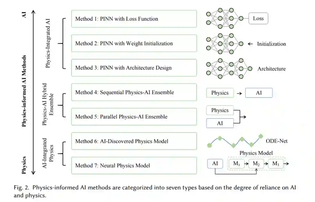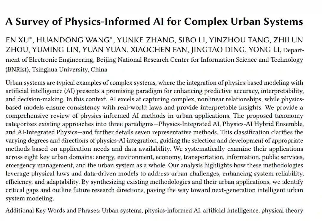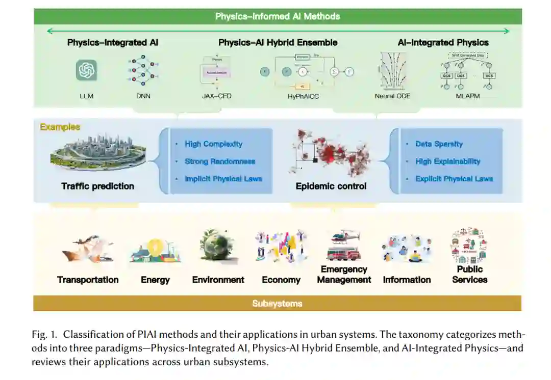 城市系统是复杂系统的典型代表,其中基于物理建模与人工智能(AI)的融合为提升预测精度、可解释性与决策支持能力提供了极具前景的新范式。在这一背景下,人工智能擅长捕捉复杂的非线性关系,而物理模型则确保结果符合现实世界的物理规律,并提供可解释的见解。 本文系统回顾了物理引导人工智能(Physics-Informed AI)在城市应用中的研究进展。我们提出了一种分类体系,将现有方法划分为三种主要范式:物理-融合AI(Physics-Integrated AI)、物理与AI混合集成(Physics-AI Hybrid Ensemble)、AI-融合物理模型(AI-Integrated Physics),并进一步详述了七类具有代表性的方法。这一分类体系厘清了物理与AI融合的不同程度与方向,为基于具体应用需求和数据可用性选择与发展合适的方法提供指导。 我们系统梳理了物理引导AI在八大关键城市领域中的应用:能源、环境、经济、交通、信息、公共服务、应急管理以及城市系统整体层面。分析表明,这些方法通过结合物理规律与数据驱动模型,有效应对城市挑战,提升了系统的可靠性、效率与适应性。 通过综述现有方法及其城市应用,我们识别出当前研究中的关键空白,并提出未来的研究方向,为构建新一代智能城市系统建模方法奠定基础。