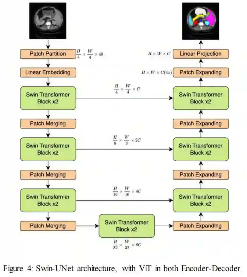 许多研究人员在编码器和解码器架构中都利用了ViTs,以充分利用注意力机制。Coa等人引入了Swin-Unet,用于医学图像分割。他们的架构基于Swin Transformer,其中编码器采用移位窗口方法,解码器中具有patch嵌入层。编码器和解码器架构都是分层设计的,以增强分割准确性和鲁棒性。Zhou等人提出了nnFormer,这是一种体积 Transformer 网络,用于进行分割。该架构利用基于注意力的跳接连接,以将体积图像中的局部和长期关系相结合。