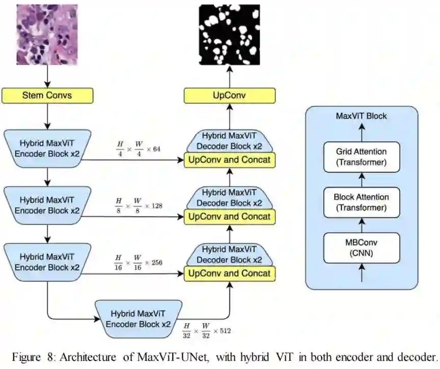 许多研究人员在他们的架构中同时使用ViT和基于CNN的模块,在编码器和解码器部分。最近,MaxViT-UNet作为一种创新的高ViT-UNet解码器,专门用于医学图像分割[101]。作者有效地利用了多轴自注意力机制,允许模型在局部和全局轴上关注特征,从而增强目标和背景区域之间的判别能力,从而提高分割效率[102]。