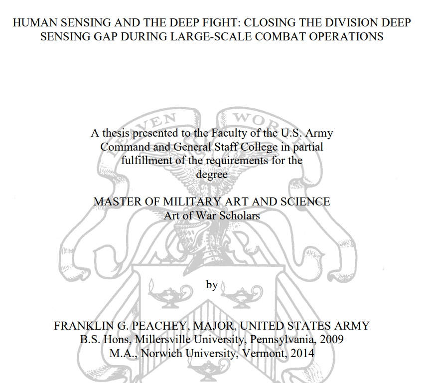 在专注于反叛乱行动近 20 年后,美国陆军正重新将重点放在大规模作战行动上。在重新夺回陆域主导权的过程中,陆军已将纵深感知确定为当前的能力缺口。本研究的重点是一个师有效塑造其纵深区域所需的战术纵深感知。自 21 世纪初陆军转型为以旅为中心的部队以来,师在纵深区域内的感知能力出现了差距。造成这种差距的原因是,技术和人力感知能力被剥离并调整到了师之外。然而,一个师要想有效地为其旅级战斗队塑造战斗,就必须能够在其纵深区域内进行感知。本文将探讨人类感知能力如何有助于缩小师纵深感知差距。