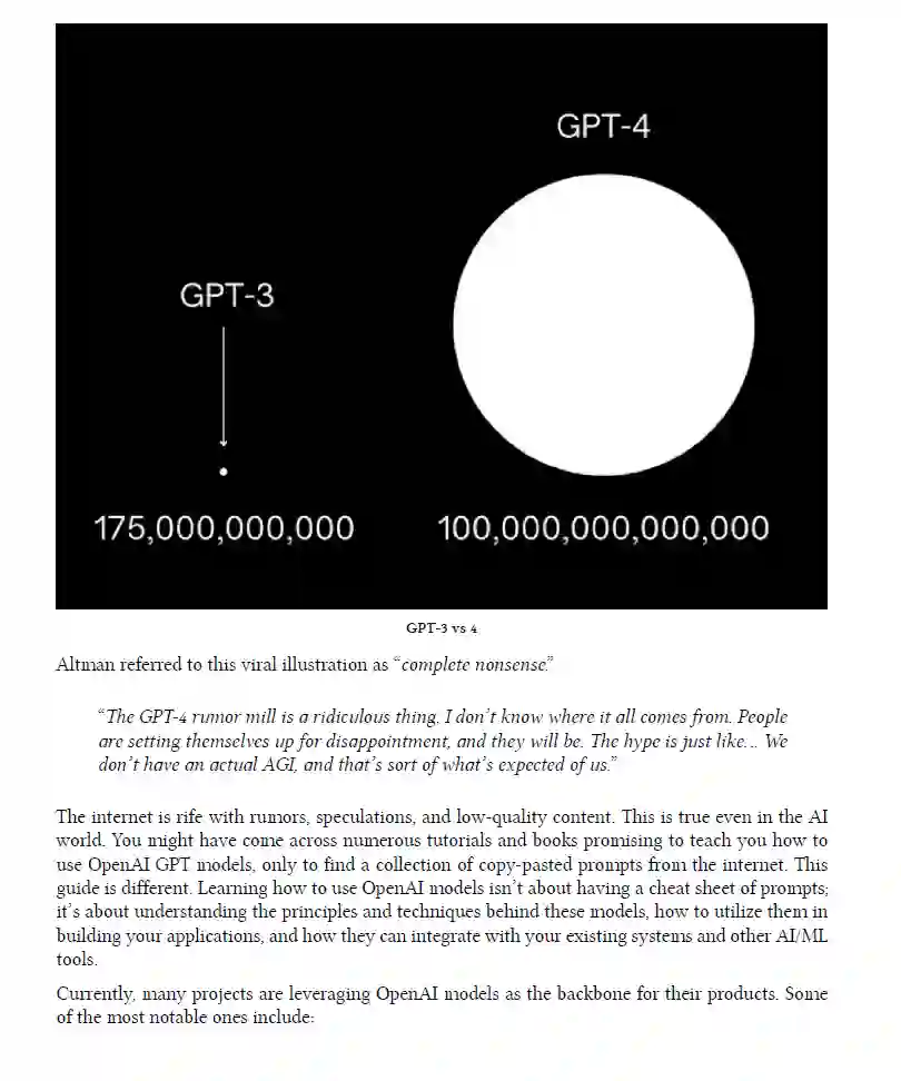 通过阅读本指南并跟随示例,您将能够: * 了解不同的模型,以及如何以及何时使用每一个模型。 * 生成类人文本,用于回答问题、创建内容和其他创造性用途。 * 控制GPT模型的创造力,并采用最佳实践来生成高质量文本。 * 转换和编辑文本以执行翻译、格式化和其他有用的任务。 * 使用各种参数和选项(如max_tokens、temperature、top_p、n、stream、logprobs、stop、presence_penalty、frequency_penalty、best_of等)优化GPT模型的性能。 * 在使用API时进行词干提取、词形还原和降低成本。 * 理解上下文填充、链接和练习提示工程。 * 实现具有记忆和上下文的聊天机器人。 * 创建预测算法和零样本技术,并评估它们的准确性。 * 理解、练习并改进小样本学习。 * 理解微调并利用其力量创建您自己的微调模型。 * 理解并使用微调最佳实践 * 练习使用GPT的训练和分类技术。 * 理解嵌入以及公司如特斯拉和Notion是如何使用它的。 * 理解并实施语义搜索、RAG和其他高级工具和概念。 * 将向量数据库(例如:Weaviate)与您的智能系统集成。
