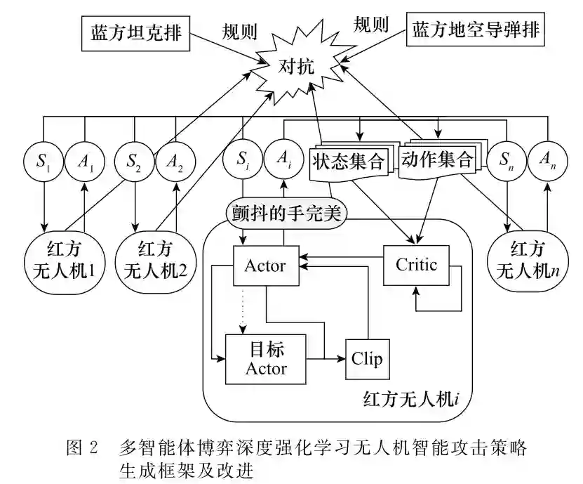 强化学习[17]是让智能体以最大化奖励函数为目标,在试错中学习的算法,非常适合解决序贯决策类问题。深度学习[18]是用神经网络从原始输入中提取高级特征的一类机器学习算法。在深度学习普及之前,强化学习需要用人工提取特征来表示复杂博弈的状态信息,神经网络可以作为一个自适应函数近似器,允许强化学习扩展到高维状态空间[19]和续动作空间[20]。深度强化学习是上述两种算法的结合,兼具二者的优点。 本文尝试使用多智能体博弈强化学习方法来解决无人机智能攻击策略的生成与优化问题。将无人机智能攻击策略生成问题建模为博弈问题,并尝试将多智能体深度确定性策略梯度算法应用于解决此类问题。