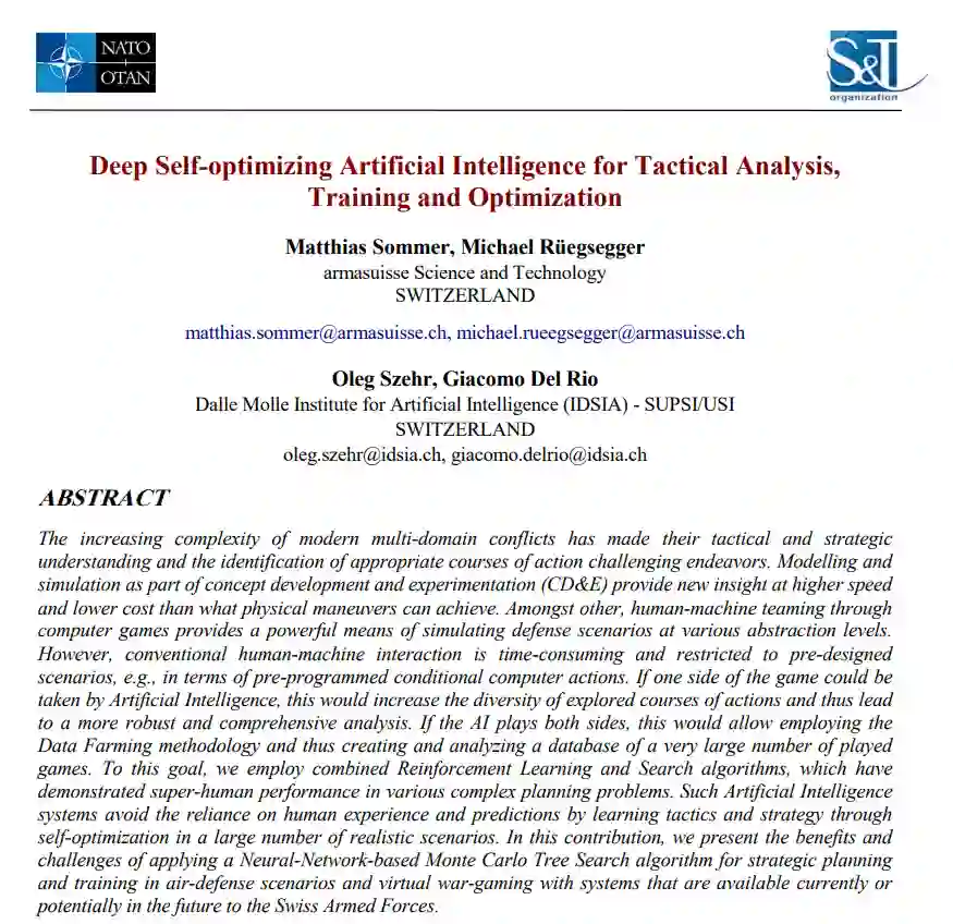 现代多领域冲突日益复杂,使得对其战术和战略的理解以及确定适当行动方案具有挑战性。作为概念开发和实验 (CD&E) 的一部分的建模和仿真提供了新的见解,以更快的速度和更低的成本比物理机动更易实现。其中,通过计算机游戏进行的人机协作提供了一种在各种抽象级别模拟防御场景的强大方法。然而,传统的人机交互非常耗时,并且仅限于预先设计的场景,例如,在预先编程的条件计算机动作。如果游戏的某一方面可以由人工智能来处理,这将增加探索行动过程的多样性,从而导致更强大和更全面的分析。如果AI同时扮演两个角色,这将允许采用数据农场方法,从而创建和分析大量已玩游戏的数据库。为此,我们采用了强化学习和搜索算法相结合的方法,这些算法在各种复杂的规划问题中都表现出了超人的表现。这种人工智能系统通过在大量现实场景中通过自我优化来学习战术和策略,从而避免对人类经验和预测的依赖。在这篇文章中,我们介绍了将基于神经网络的蒙特卡罗树搜索算法应用于防空场景和虚拟战争游戏中的战略规划和训练的好处和挑战,这些系统目前或未来可能用于瑞士武装部队。