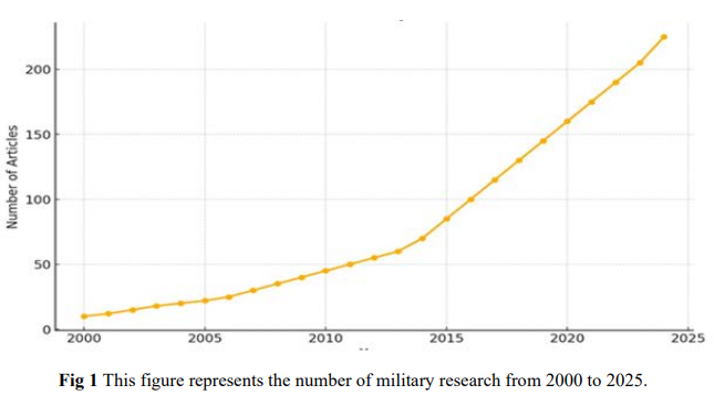 现代战争已变得日益复杂,要求军事训练方法不断进步,使人员能够应对快速变化和不可预测的战斗局势。本文提出一种将大数据与实况、虚拟与构造(LVC)模拟相结合的新方法。通过考虑广泛的因素,该方法提高了战争能力效能(WCE)分析的准确性,支持武器研发、作战规划和训练。它旨在解决当前局限性并为该领域未来研究奠定基础[1]。POSNA领导力项目帮助小儿骨科手术领导者发展有效指导团队所需的关键技能[2]。本章节阐释了作战胜利取决于根据具体情况平衡时间、空间和力量。成功没有固定公式,因此领导者必须理解这些因素如何相互影响。例如,放弃空间可以赢得时间,在正确时间和地点使用恰当力量可能更有效[3]。本研究引入一个虚拟射击场来帮助训练士兵的战术行动能力。它包括如丛林、乡村、海岸和雪域等逼真的3D环境,以及武器和目标。士兵使用虚拟现实眼镜和VR控制器进行训练,参与者认为其真实且易于使用[4]。数字孪生技术被用于许多行业(包括军事领域)以提高效率并节约成本。数字孪生是通过传感器收集数据创建的物理系统的虚拟版本,有助于预测系统行为。该技术在错误代价高昂的军事系统中尤为有用。本研究探讨了数字孪生在军事中的应用、其益处及未来前景[5]。通过整合机器学习、自然语言处理和计算机视觉等工具,人工智能驱动的模拟能够以高度真实性对复杂战斗情境进行建模。这不仅改善了决策能力和战略思维,还使军事人员为适应不可预测的高压环境做好准备,图1显示了2000年至2025年发表文章数量的增长。起初增长缓慢,但2010年后增速加快如图1所示。本文通过引入一种由人工智能工具驱动的实时军事训练模拟器来应对这一挑战。该模拟器旨在使训练场景更加真实和适应性强,为学员提供更具沉浸感和影响力的学习体验。本综述将聚焦以下关键目标:开发一个灵活框架来建模战争场景中的不同状态和转换,作为交互式、自适应训练模拟器的基础;在动态训练环境中测试模拟器,以评估其在变化条件下的有效性;验证该模拟器作为一种高效训练工具,能够弥补当前军事训练系统的不足,提供更真实和自适应的体验。