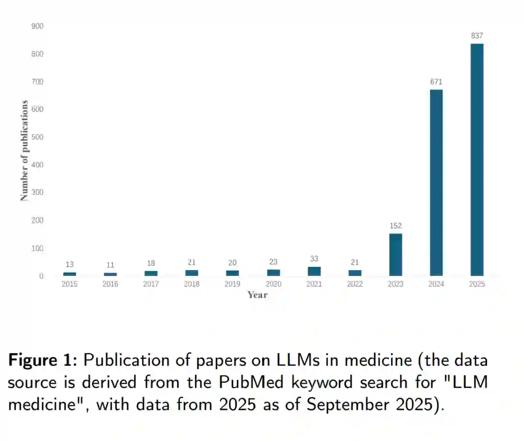 文献回顾方法学:为确保对医学领域 LLM 的全面、专业考察,我们采用系统综述的方法。具体而言,在 Web of Science、DBLP、IEEE Xplore 与 Google Scholar 等主要学术数据库中,以“LLM medicine”“medical LLM”为核心关键词进行检索。在优先考虑 2020–2025 年间的出版物的同时,也纳入了 2020 年以前对该领域有重要推动作用的奠基性研究。首先基于题目与摘要对检索文献进行相关性筛选;在初筛之后,依照预设步骤进一步遴选,确保入选研究兼具相关性与高质量。(1)纳入标准:提出创新方法论、理论分析或对其观点进行实验验证的综述;考察一个或多个医学 LLM 从训练到部署过程的文献;经过正式同行评审的英文出版物。(2)排除标准:仅汇编他人成果而缺乏原创见解的文章;未经过正式同行评审的出版物;虽匹配关键词但与医学领域 LLM 直接相关性较低的研究。