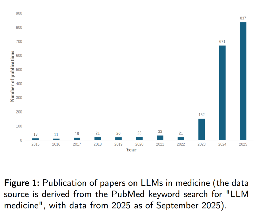 在节奏快速的医疗领域,LLM 为临床实践、医学教育与科研带来变革性潜力[9]。医学领域对 LLM 的早期使用主要基于通用预训练语言模型进行领域自适应;随着技术持续演进,LLM 发展为诸如 GPT-4[10] 等前沿模型。这些模型突破了传统方法的限制,能够处理更复杂的语言理解与处理任务。通过分析医学数据并为医生与其他卫生专业人员制定更精准的诊断与个性化治疗方案,LLM 有望重塑医疗行业[11]。该技术不仅为临床与公共卫生工作者提供前所未有的强大工具,也深刻改写了我们对疾病诊断与治疗路径的理解与实践。借助先进的深度学习架构与经精调的机器学习模型,对海量医学数据进行深度挖掘与分析,LLM 能够模拟并生成与原始信息高度相似、甚至更为准确的新内容,从而确保有效的知识传递与创新。 具体而言,LLM 在医疗行业的潜在变革性影响主要体现在三方面:其一,为医学数据评估提供新维度,使以往难以捕捉的细微变化与趋势显性化,为疾病的早期发现与干预提供有力支持;其二,在诊断层面,AI 算法可基于复杂数据分析给出更为准确的诊断意见——有时甚至超过人类经验——显著提升诊断准确率与效率[12];其三,在治疗方案制定方面,LLM 可依据个体特征、疾病进程与治疗反应,帮助确保每位患者获得个性化治疗,真正实现精准医学的愿景[13]。这些以数据为驱动并经多轮训练迭代的医学 LLM,不仅具备强大的诊断判断力,也能在罕见病例诊断与治疗策略制定中快速响应临床需求;它们通过检索相关医学文献、病例分析与专家建议为医生提供有价值的参考[14, 15]。与此同时,医学 LLM 在口腔医学[16]、放射学[17]、核医学[18]与临床实践[19]等众多领域展现出潜在能力。目前,关于医学 LLM 的研究如火如荼,相关论文的发表与引用呈上升趋势(见图 1),应用前景广阔。