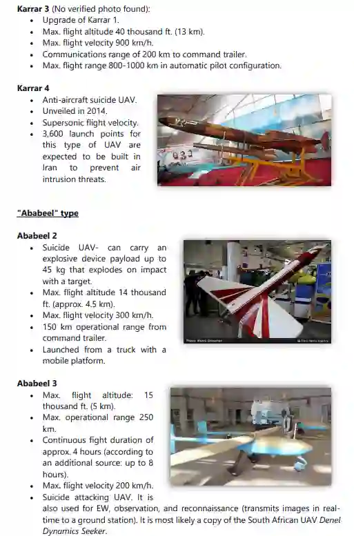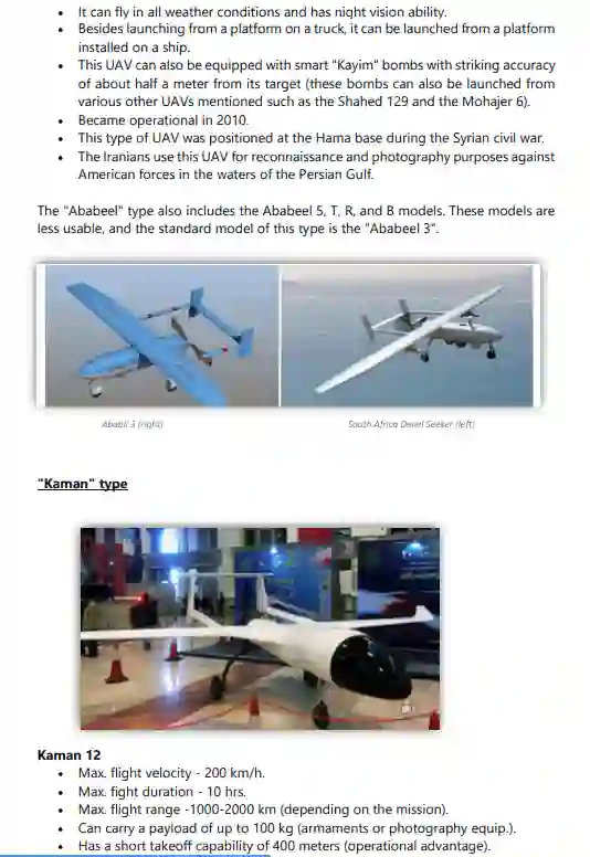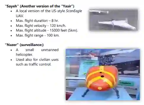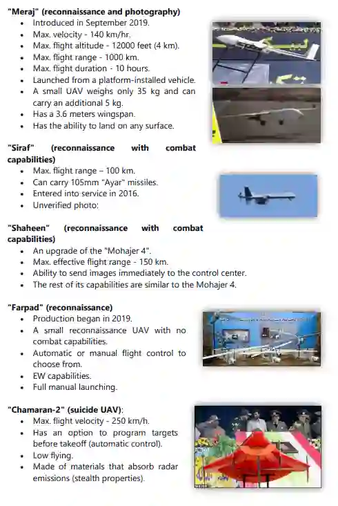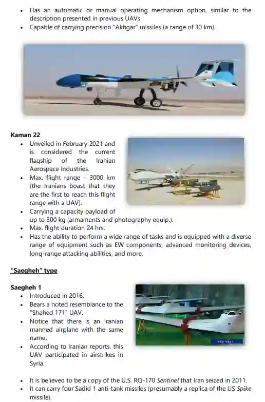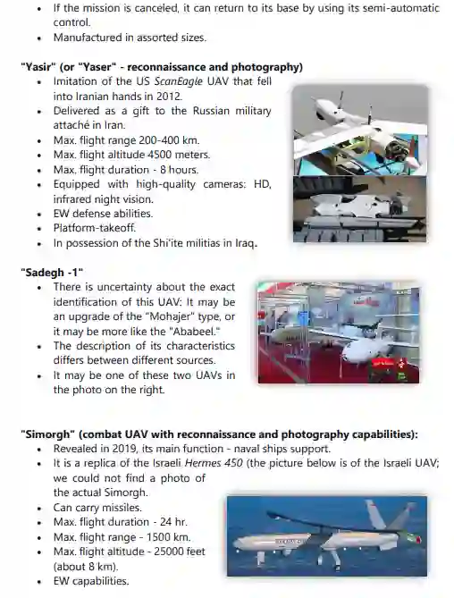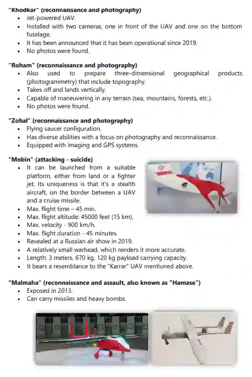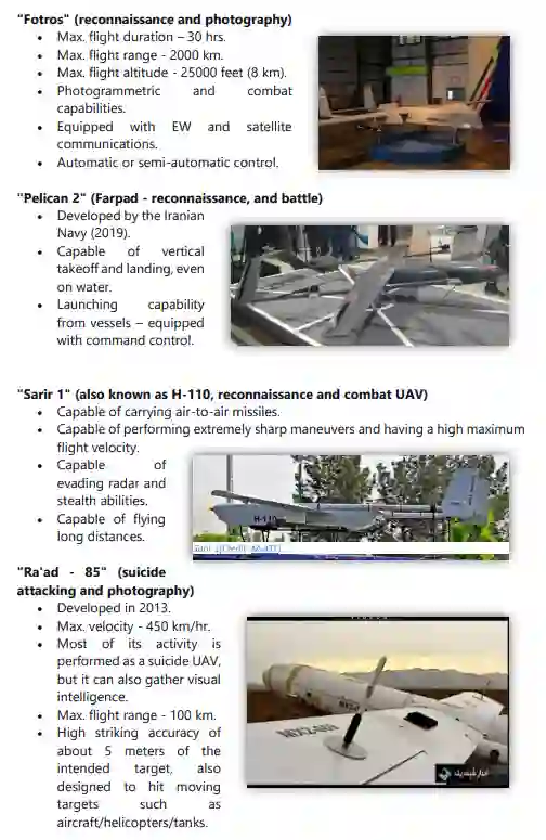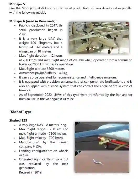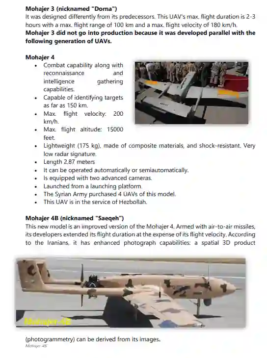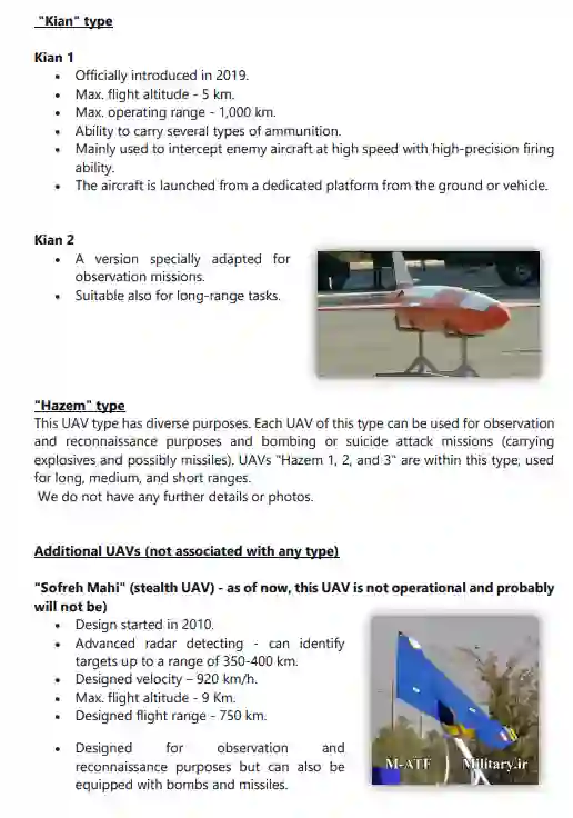 与 "Talash"平行,"Mohajer"型是无人机的一个主要类型,从1980年代初/中期开始在伊朗生产,直到今天。其他著名的型号包括 "Shahed "和 "Samed"(KAS-04)、"Karrar"、"Ababeel"、"Kaman"、"Saegheh"、"Hodhod"、"Kian"。此外,还单独开发了其他型号的无人机,与任何特定类型无关。