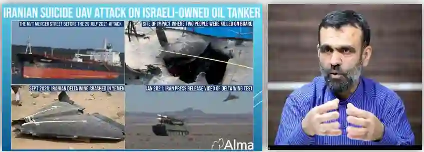 2021年7月30日,一名以色列商人的MT Mercer Street号油轮在阿曼湾水域航行时遭到攻击。袭击的无人机被确认为Shahed 136,固定有三角翼;其飞行距离约为2000-2200公里。对这次袭击负有直接责任的是伊斯兰革命卫队空军无人机阵列的负责人赛义德-阿拉-贾尼(如下图)。