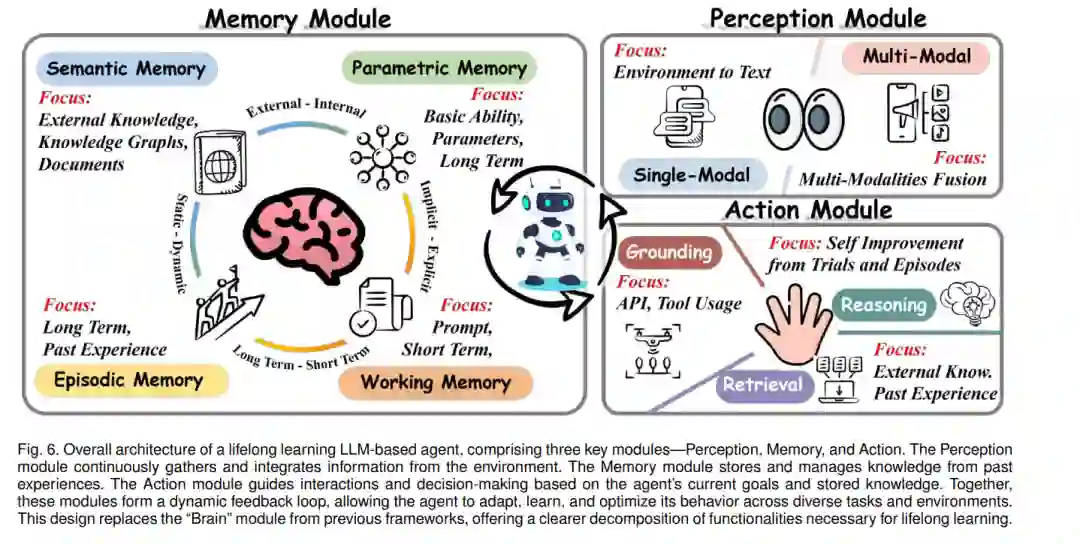 终身学习的基于LLM的智能体架构旨在持续适应、整合并优化其在一系列任务和环境中的行为。在本小节中,我们识别了三个关键模块——感知、记忆和行动——它们共同支持终身学习。这个划分遵循了先前工作中提出的框架[14],但有一个显著的不同:我们没有保留“脑”模块,而是采用了[14]中提出的“记忆”模块,具有更清晰的功能性和改进的模块化结构。 每个模块相互作用,确保智能体能够处理新信息、保留有价值的知识并选择适应当前情境的合适行动。这三个模块的设计理念来源于智能体的需求:(i) 感知和解读不断变化的数据,(ii) 存储和管理来自过去经验的知识,(iii) 执行适应变化环境的任务。 这三个模块构成了一个动态反馈回路:感知模块将新信息传递给记忆模块,在记忆模块中进行存储和处理。记忆模块随后引导行动模块,影响环境并为未来的感知提供信息。通过这一持续循环,智能体不断完善其知识,提升适应性,最终提高其在复杂动态环境中的表现。