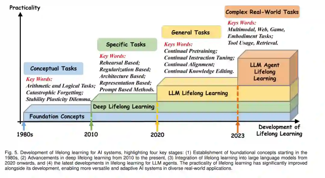 终身学习,也称为持续学习或增量学习,基于这样一个理念:智能系统应该像人类一样,持续地获取、完善和保留知识,贯穿整个生命周期。与传统的机器学习方法不同,传统方法假设数据集是固定的、静态的,而终身学习框架则面临数据和任务随时间演变的现实,模型必须在不遗忘已掌握技能的前提下进行适应。图5展示了终身学习发展的示意图。