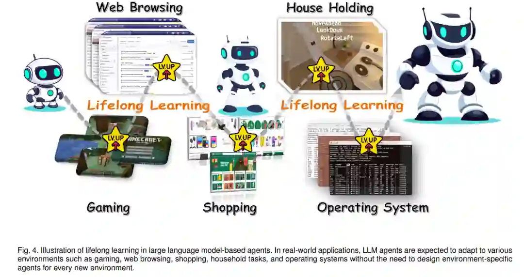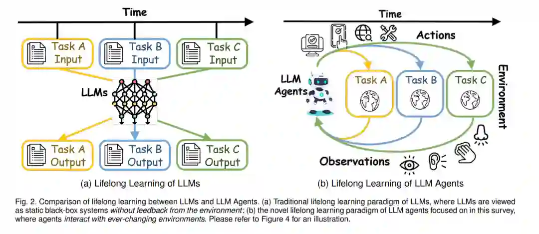将终身学习融入LLM智能体的动机源于开发能够不仅适应新任务,还能在广泛的动态环境中保留并应用先前知识的智能系统的需求,这与Legg等人[5]将智能定义为快速适应广泛环境的观点相契合。目前,现有的LLM智能体通常被开发为静态系统,限制了它们在面对新挑战时的演变能力。此外,大多数关于LLM的终身学习研究[1],[4]集中于处理不断变化的数据分布,而非与环境进行互动。例如,通过持续微调LLM以适应特定领域的指令[1]。然而,这些方法仍将LLM视为静态黑箱系统,并未解决LLM在真实世界环境中进行互动学习的实际需求。图2比较了传统的终身学习范式与本调查中讨论的、LLM智能体与动态环境互动的新范式。 在现实世界的应用中,LLM智能体需要适应多样的环境,如游戏、网页浏览、购物、家庭任务和操作系统,而无需为每个新情境设计单独的智能体。通过引入终身学习能力,这些智能体可以克服这一局限性。它们能够持续学习并存储来自多种模态(如视觉、文本、传感数据)的知识,使其在环境变化时能够进行实时适应和决策[18]–[21]。将终身学习融入LLM智能体,可以释放它们在动态现实应用中的全部潜力[22],[23]。因此,这些智能体能够不断演变、获得新知识,并保持关键信息,从而增强其适应性和多功能性。这个持续学习的过程对那些挑战不断出现的环境尤为重要,如自主机器人、互动助手和自适应决策支持系统[14]。图4展示了一个终身学习的LLM智能体示意图。