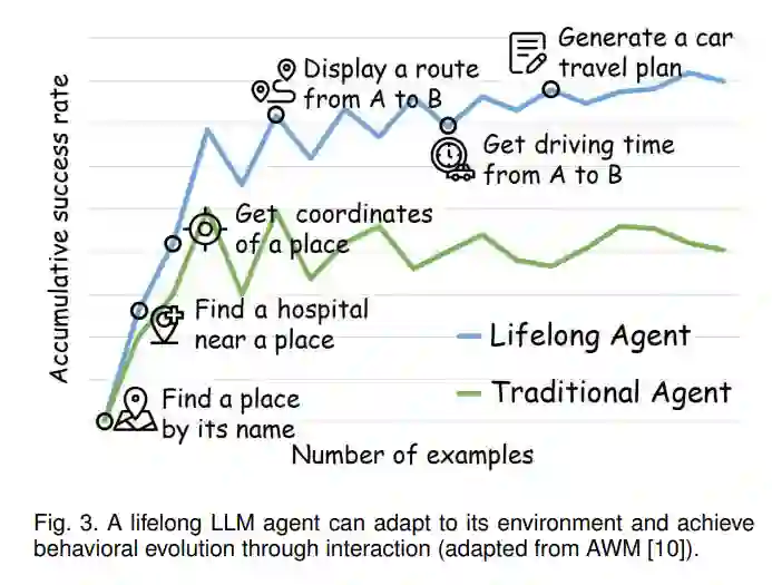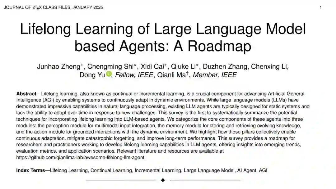 摘要—终身学习,也称为持续学习或增量学习,是推进人工通用智能(AGI)的关键组成部分,通过使系统在动态环境中持续适应。尽管大规模语言模型(LLM)在自然语言处理领域展现了出色的能力,但现有的LLM智能体通常是为静态系统设计的,缺乏根据新挑战随时间适应的能力。本调查是首个系统总结将终身学习纳入基于LLM的智能体的潜在技术的文献。我们将这些智能体的核心组件分为三个模块:感知模块,用于多模态输入的集成;记忆模块,用于存储和检索不断发展的知识;以及行动模块,用于与动态环境的实际互动。我们强调这三个支柱如何共同实现持续适应,缓解灾难性遗忘,并提高长期性能。本调查为从事基于LLM智能体的终身学习能力开发的研究人员和从业人员提供了一条发展路线图,提供了关于新兴趋势、评估指标和应用场景的见解。相关文献和资源可通过以下链接获取: