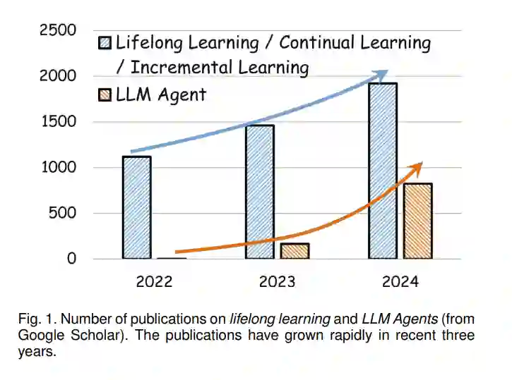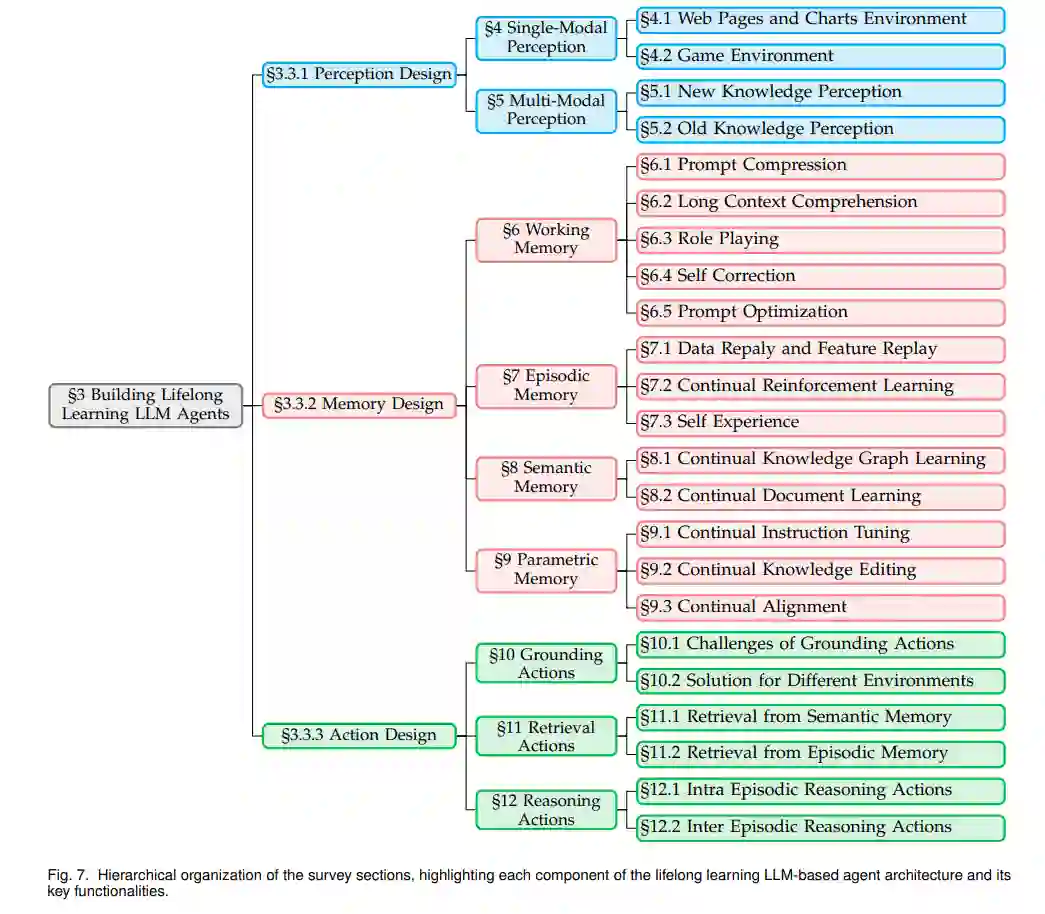 本调查提供了关于基于LLM的智能体终身学习系统的关键概念、技术和挑战的全面概述。作为首个系统总结将终身学习纳入LLM智能体的潜在技术的文献,本调查将重点回答以下研究问题(RQ): RQ1:为终身学习设计的LLM智能体的核心概念、开发流程和基本架构是什么?(第3节) RQ2:LLM智能体如何持续感知和处理单模态和多模态数据,以适应新环境和任务?(第4、5节) RQ3:什么策略可以减轻灾难性遗忘并保留已学知识?(第6、7、8、9节) RQ4:LLM智能体如何在动态环境中执行各种动作,如扎根、检索和推理?(第10、11、12节) RQ5:评估终身学习在LLM智能体中表现的评估指标和基准是什么?(第13节) RQ6:终身学习LLM智能体的现实应用和使用案例是什么?它们如何从持续适应中受益?(第14节) RQ7:开发LLM智能体终身学习面临的关键挑战、局限性和未解问题是什么?(第15节) 通过回答这些研究问题,本调查作为理解LLM智能体中终身学习的设计、挑战和应用的逐步指南。它回顾了最前沿的技术,并突出了新兴趋势和未来的研究方向。