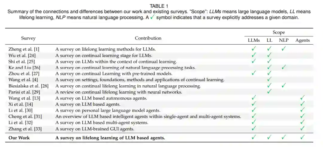 据我们所知,这是首个系统回顾终身学习与LLM智能体交叉领域最新进展的调查。本调查的主要贡献如下: