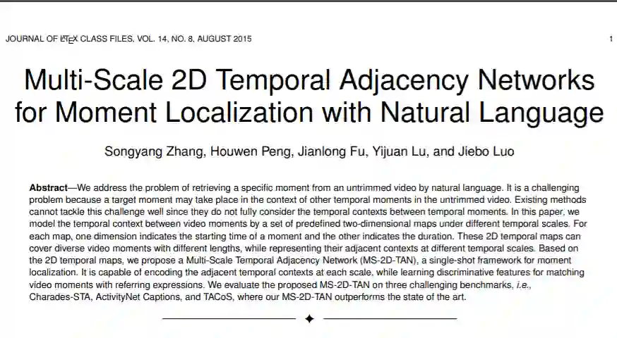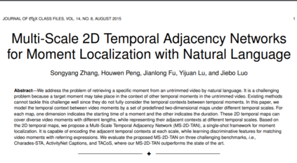 当时间的维度从一维走向二维,时序上的建模方式也需要相应的改变。本文提出了多尺度二维时间图的概念和多尺度二维时域邻近网络(MS-2D-TAN)用于解决视频时间定位的问题。本文拓展自 AAAI 2020 [1],并将单尺度的二维时间建模拓展成了一个多尺度的版本。新模型考虑了多种不同时间尺度下视频片段之间的关系,速度更快的同时精度也更高。本文在基于文本的视频时间定位任务中验证了其有效性。相关内容将发表在 TPAMI上。