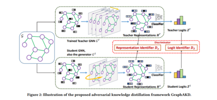 深度图神经网络(Deep graph neural networks, GNNs)能够很好地表达图结构数据的建模。然而,深度图模型的过载架构使得其难以在移动或嵌入式系统上部署和快速测试。为了压缩重叠的GNN,通过师生架构进行知识蒸馏是一种有效的技术,其中的关键步骤是用预定义的距离函数测量教师和学生网络之间的差异。然而,对各种结构的图使用相同的距离可能是不合适的,最优距离公式难以确定。为了解决这些问题,我们提出了一种新的对抗性知识蒸馏框架,命名为GraphAKD,它对抗性训练一个鉴别器和一个生成器,自适应检测和减少差异。特别地,注意到良好捕获的节点间和类间相关性有利于深度GNN的成功,我们提出使用可训练的鉴别器来批判从节点级和类级视图继承的知识。鉴别器区分老师的知识和学生继承的知识,而学生GNN作为生成器,目的是欺骗鉴别器。据我们所知,GraphAKD是第一个将对抗性训练引入到图领域知识蒸馏的系统。在节点级和图级分类基准上的实验表明,GraphAKD在很大程度上提高了学生的表现。结果表明,GraphAKD能够准确地将知识从复杂的教师GNN传递到紧凑的学生GNN。