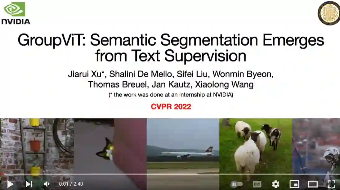 分组和识别是视觉场景理解的重要组成部分,例如对象检测和语义分割。在端到端深度学习系统中,图像区域的分组通常通过像素级识别标签的自顶向下的监督隐式进行。相反,在本文中,我们提出将分组机制引入到深度网络中,允许语义段在只有文本监督的情况下自动出现。我们提出了一种分层的分组视觉Transformer (GroupViT),它超越了规则的网格结构表示,学习将图像区域分组成逐渐增大的任意形状的片段。我们通过对比损失在大规模图像-文本数据集上联合训练GroupViT和文本编码器。GroupViT只有文本监督,没有任何像素级的注释,它学会了将语义区域组合在一起,并以零样本的方式成功地迁移到语义分割的任务中,即没有任何进一步的微调。它在PASCAL VOC 2012上实现了51.2%的mIoU的零样本学习精度,在PASCAL上下文数据集上实现了22.3%的mIoU,并与需要更高水平监督的最先进的迁移学习方法相匹配。