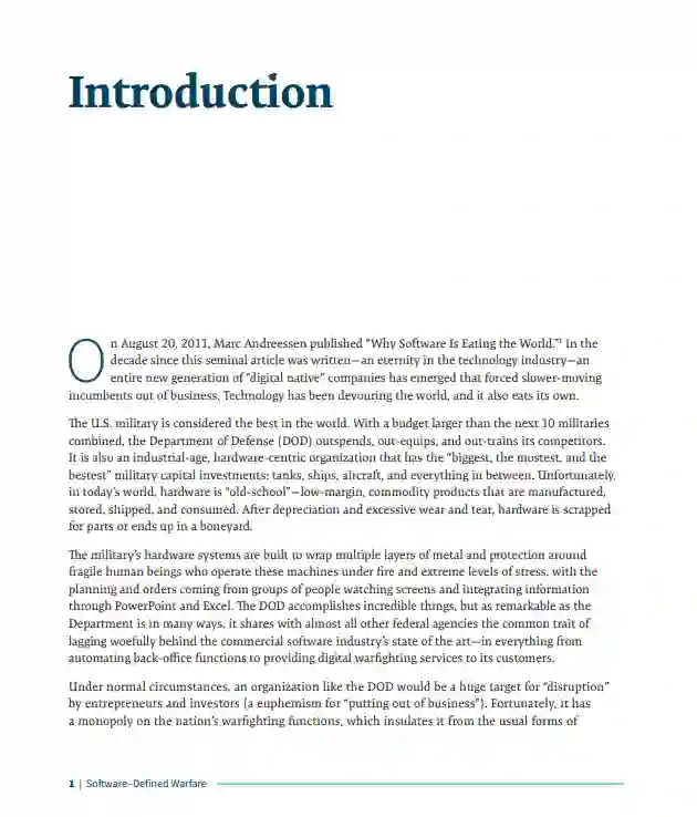 从发展的眼光看,军事装备架构的关键在于软件,其正在颠覆和重组整个行业,尤其是依赖人工流程的零成本活动。若要想获取足够的竞争力,软件就必须成为业界模式和作战模式的核心。