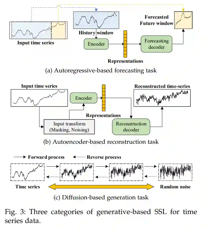 3. 基于生成的方法:在这个类别中,预文本任务是基于给定的数据视图生成预期的数据。在时间序列建模的背景下,常用的预文本任务包括使用过去的系列来预测未来的时间窗口或特定的时间戳,使用编码器和解码器重构输入,以及预测被遮盖的时间序列的未见部分。本节从自回归预测、基于自编码器的重构和基于扩散的生成的角度整理了时间序列建模中现有的自监督表示学习方法。值得注意的是,基于自编码器的重构任务也被视为一种无监督框架。在自监督学习(SSL)的背景下,我们主要使用重构任务作为预文本任务,最终目标是通过自编码器模型获得表示。