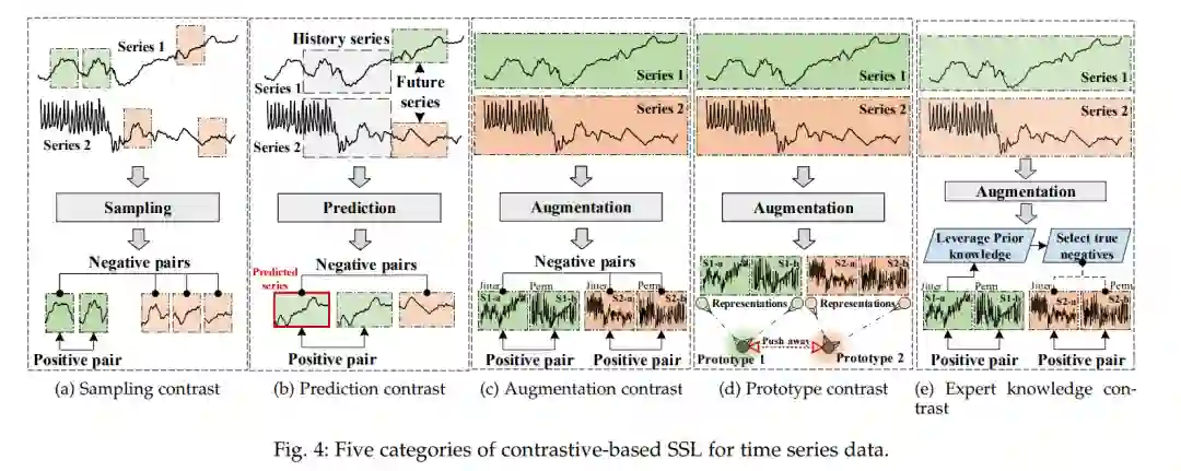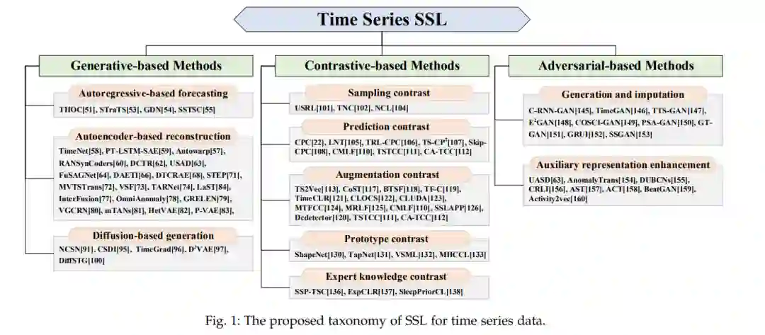 据我们所知,尚未有针对时间序列数据的自监督学习(SSL)的全面和系统的回顾,这与关于CV或NLP的SSL的丰富文献形成鲜明对比 [17], [18]。Eldele等人[19]和Deldari等人[20]提出的调查与我们的工作在某种程度上相似。然而,这两篇综述仅讨论了自监督对比学习(SSCL)的一小部分,这需要更全面的文献回顾。此外,还需要包括基准时间序列数据集的总结,而时间序列SSL的潜在研究方向也非常稀少。本文回顾了当前针对时间序列数据的最先进的SSL方法。我们首先总结了关于SSL和时间序列数据的最近综述,然后从三个角度提出了一种新的分类法:基于生成的,基于对比的和基于对抗的。这个分类法与刘等人[21]提出的类似,但专注于时间序列数据。对于基于生成的方法,我们描述了三个框架:基于自回归的预测,基于自编码器的重构和基于扩散的生成。对于基于对比的方法,我们根据正样本和负样本的生成方式,将现有的工作划分为五个类别,包括采样对比,预测对比,增强对比,原型对比和专家知识对比。对于每一个类别,我们分析其见解和局限性。然后我们整理和总结了基于两个目标任务的基于对抗的方法:时间序列生成/插补和辅助表示增强。所提出的分类法显示在图1中。我们通过讨论时间序列SSL的可能未来方向来结束这项工作,包括数据增强的选择和组合,SSCL中正样本和负样本的选择,时间序列SSL的归纳偏见,SSCL的理论分析,时间序列的对抗攻击和鲁棒分析,时间序列领域适应,时间序列的预训练和大型模型,时间序列SSL在协作系统中的应用,以及时间序列SSL的基准评估。