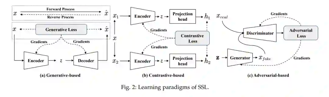 这个类别关注模型架构和训练目标。SSL方法大致可以分为以下几类:基于生成的方法、基于对比的方法和基于对抗的方法。这些类别的模型架构如图2所示,可以总结为: