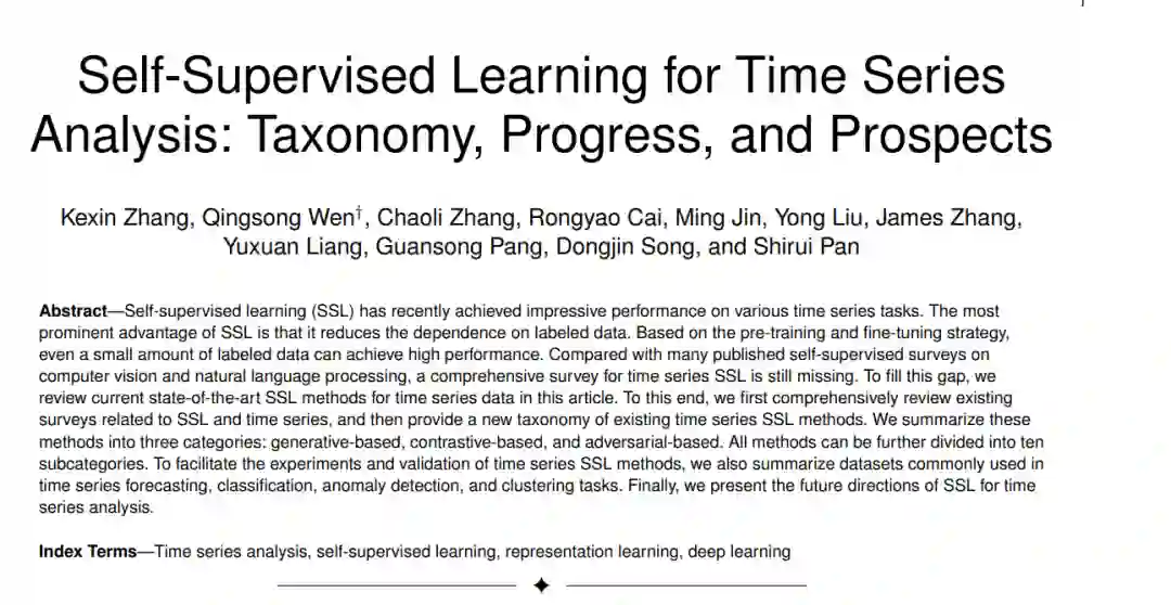 7 结论:本文集中讨论时间序列自监督学习(SSL)方法,并提供了一个新的分类法。我们根据学习范式将现有方法分为三大类:基于生成的、基于对比的和基于对抗的。此外,我们将所有方法整理成十个详细的子类别:基于自回归的预测、基于自编码器的重构、基于扩散的生成、采样对比、预测对比、增强对比、原型对比、专家知识对比、生成和填充,以及辅助表示增强。我们还提供了关于应用和广泛使用的时间序列数据集的有用信息。最后,总结了多个未来的发展方向。我们相信,这篇综述填补了时间序列SSL的空白,并激发了对时间序列数据的SSL的进一步研究兴趣。
