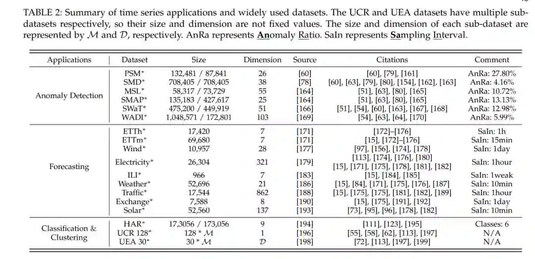 6 应用与数据集:自监督学习(SSL)在不同的时间序列任务中有很多应用,如预测、分类、异常检测等。我们根据应用领域总结了最常用的数据集和代表性的参考文献。在本文中,我们收集了四个任务中广泛使用的数据集:异常检测、预测、分类和聚类。如表2所示,我们提供了有用的信息,包括数据集名称、维度、大小、来源、引用和有用的注释。分类任务和聚类任务的数据集一起列出,因为这两个任务的目标是一致的。