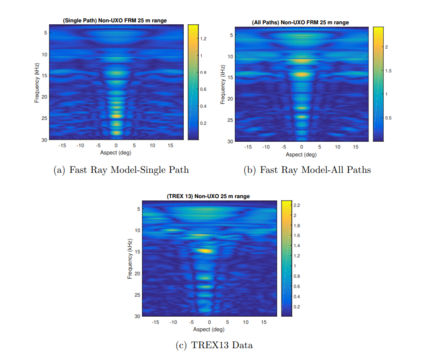 图 2.4:使用 LSAS 模型生成的非未爆炸物体声学颜色图与 TREX 数据对比。