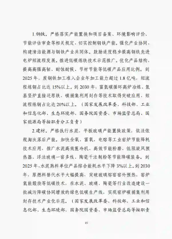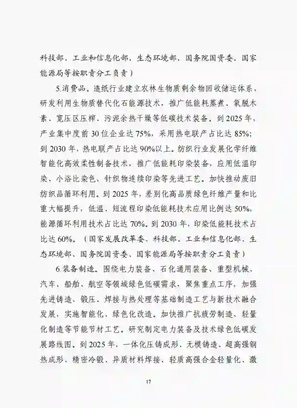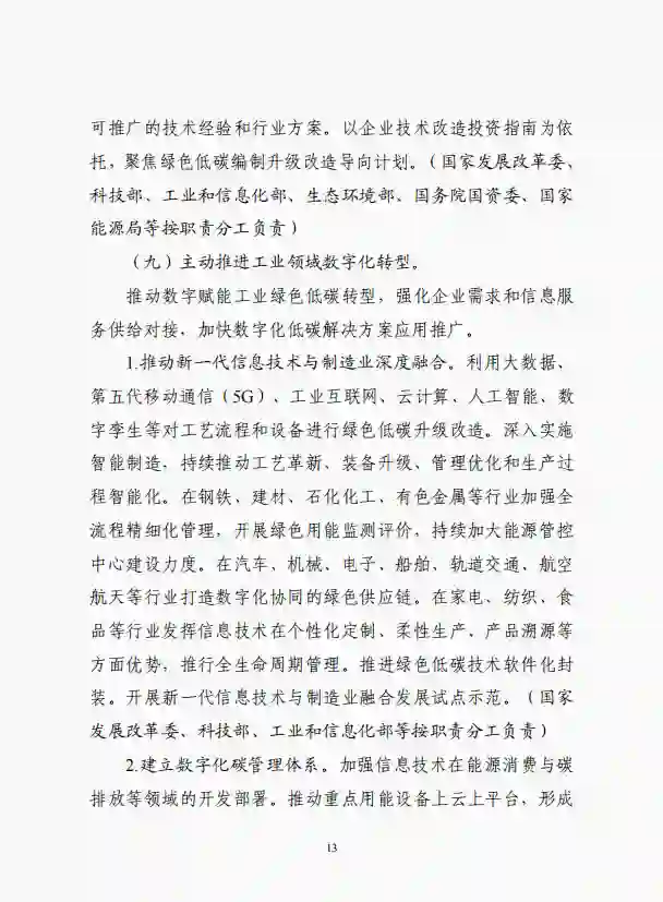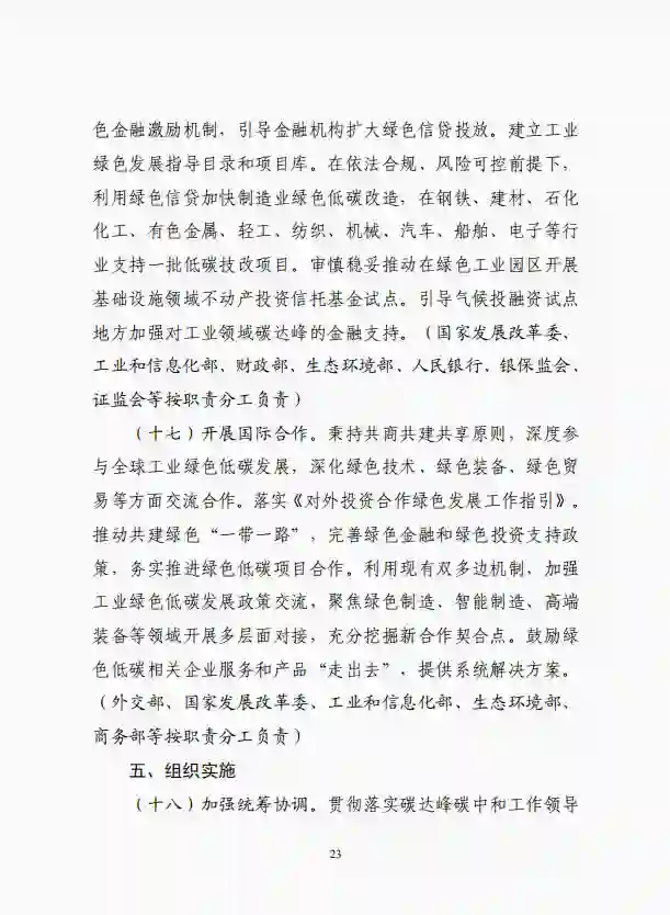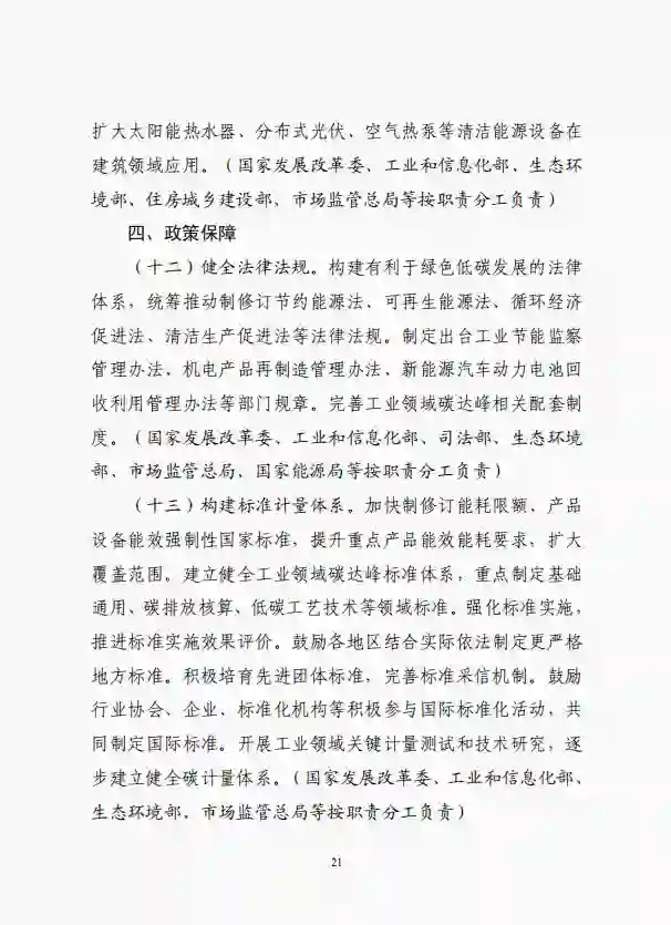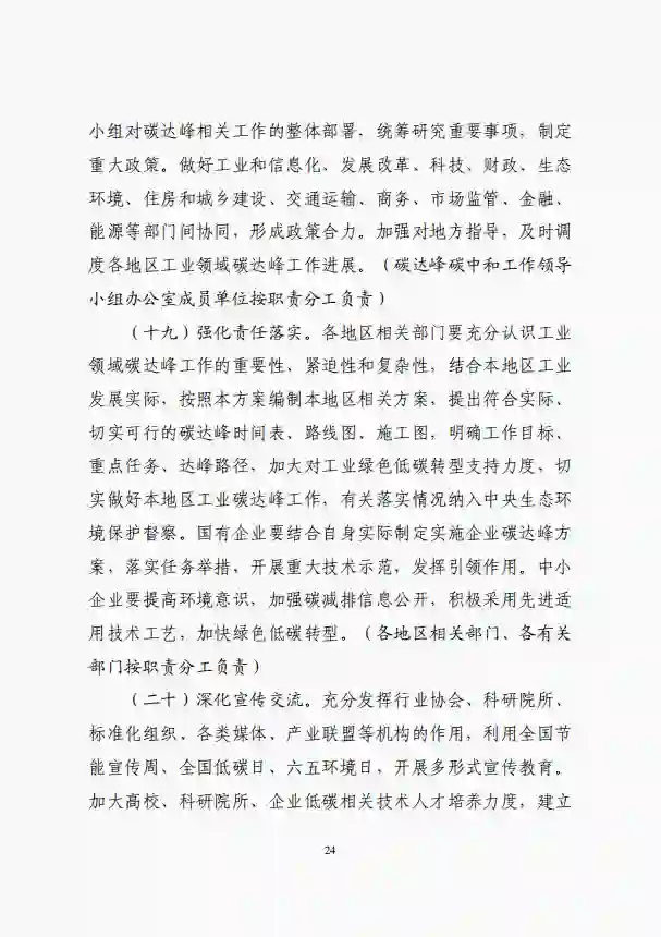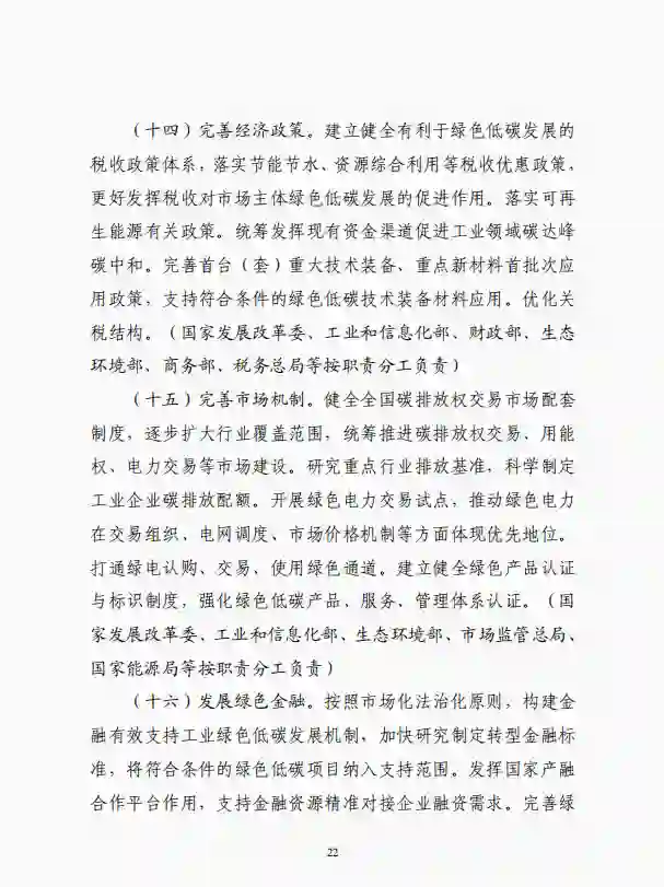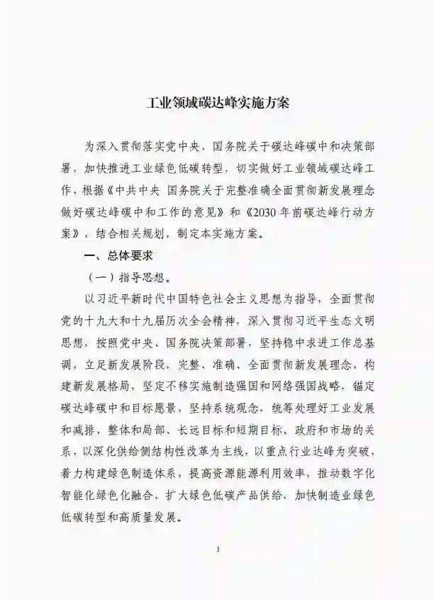 工信部联节〔2022〕88号 外交部、科技部、司法部、财政部、住房城乡建设部、交通运输部、商务部、人民银行、国资委、税务总局、市场监管总局、统计局、银保监会、证监会、能源局、林草局、邮政局,各省、自治区、直辖市及计划单列市、新疆生产建设兵团工业和信息化主管部门、发展改革委、生态环境厅(局): 《工业领域碳达峰实施方案》已经碳达峰碳中和工作领导小组审议通过,现印发给你们,请认真贯彻落实。 工业和信息化部 国家发展改革委 生态环境部 2022年7月7日