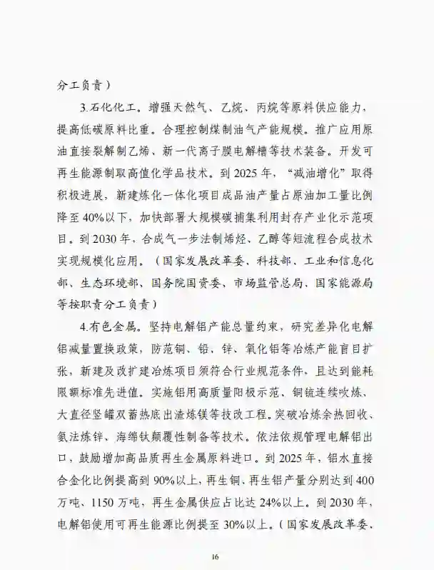 8月1日,工信部、发改委、生态环境部发布关于工业领域碳达峰实施方案的通知,涉及铝行业相关内容如下: 延伸再生资源精深加工产业链条,促进钢铁、铜、铝、铅、锌、镍、钴、锂、钨等高效再生循环利用。 坚持电解铝产能总量约束,研究差异化电解铝减量置换政策,防范铜、铅、锌、氧化铝等冶炼产能盲目扩张,新建及改扩建冶炼项目须符合行业规范条件,且达到能耗限额标准先进值。实施铝用高质量阳极示范、铜锍连续吹炼、大直径竖罐双蓄热底出渣炼镁等技改工程。突破冶炼余热回收、氨法炼锌、海绵钛颠覆性制备等技术。依法依规管理电解铝出口,鼓励增加高品质再生金属原料进口。到2025年,铝水直接合金化比例提高到90%以上,再生铜、再生铝产量分别达到400万吨、1150万吨,再生金属供应占比达24%以上。到2030年,电解铝使用可再生能源比例提至30%以上。 修订产业结构调整指导目录。严格落实钢铁、水泥、平板玻璃、电解铝等行业产能置换政策,加强重点行业产能过剩分析预警和窗口指导,加快化解过剩产能。