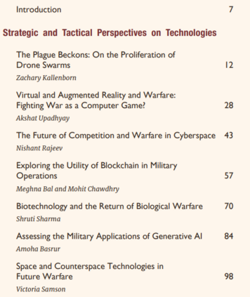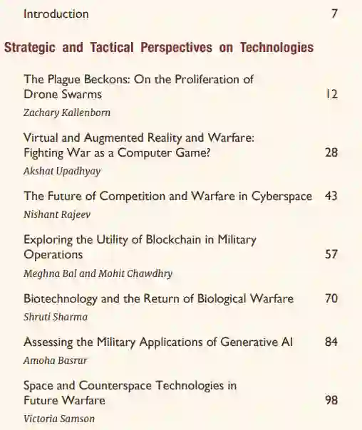 尼尚特-拉吉夫(Nishant Rajeev)从网络战的角度探讨了国家如何利用网络空间推进其战略目标。他认为,由于网络能力的独特性,国家在竞争动态中比在武装冲突或战时动态中更容易利用网络能力。接下来,Meghna Bal 和 Mohit Chawdhry 讨论了区块链技术在作战中的效用,研究了突出的早期使用案例,并认为虽然一些军队正在尝试使用该技术,但其在军事行动中的效用目前尚未得到证实。与此同时,施鲁蒂-夏尔马关注生物技术,强调了生物技术在开发和生产生物武器中的关键作用。鉴于生物智能体的潜在危险性,她认为有必要加强生物技术只用于无害途径的规范。
