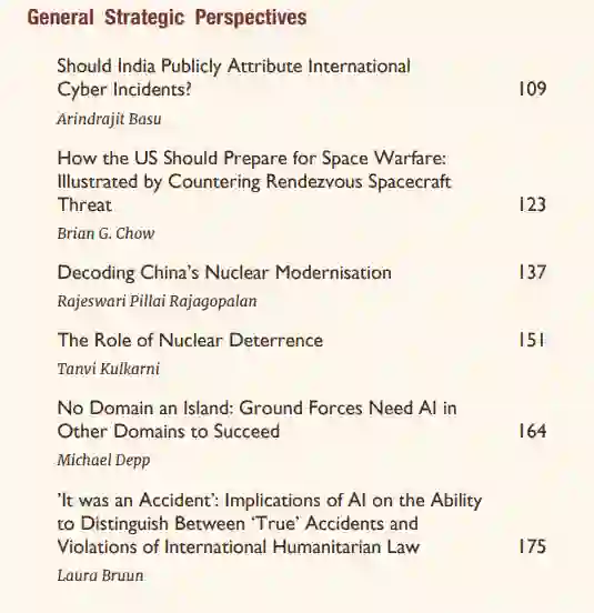 Arindrajit Basu 探讨了网络事件的归因问题,并指出印度尚未公开将具体的国际网络事件归因于具体的私人肇事者或国家。然而,随着此类网络事件的频率和强度的增加,印度不能不使用公开归因这一关键选项(如果认为有效)来应对网络不和平的不确定性,并促进其战略利益。接下来,布莱恩-G-周(Brian G. Chow)审视了美国的太空战能力,他认为,虽然美国已经加强了能力,但其整体太空复原力的强弱取决于其最薄弱的环节,尤其是当涉及到构成重大威胁的中国时。