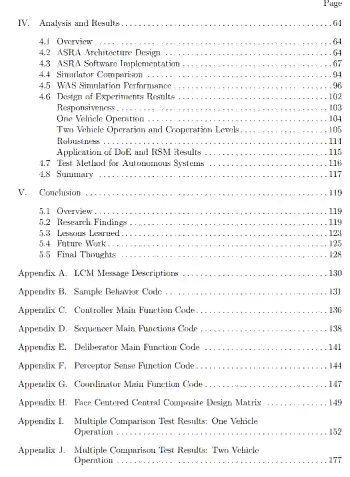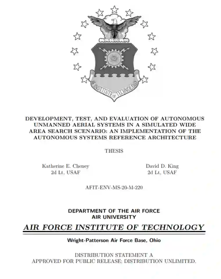 由于固有的设计复杂性、无限的测试空间和缺乏自主性的具体措施,自主和协作无人系统的实施和测试具有挑战性。这些挑战限制了美国空军部署和利用这些系统所提供的战术和战略优势能力。这项研究在广域搜索(WAS)场景中实例化了一个自主系统参考架构(ASRA),作为自主和协作系统的快速原型设计和评估的测试平台。该研究旨在提供一个框架,以评估系统实现任务和自主目标的能力,开发可重复使用的自主行为,并开发可重复使用的协作决策算法。对于这项研究和对WAS任务的应用,自主性的衡量标准来自于自主系统的要求:响应性、稳健性和感知的准确性。自主行为,包括结合简单(原子)行为的更复杂行为被开发出来,各种协作决策规则被定义。随后的评估在四个场景中实施了立体实验设计。按照严格的测试计划,测试是在仿真中进行的,实现了自动测试和快速分析。测试结果被用来创建一个响应模型来描述系统,并进行多重响应优化,以确定一个最佳配置,在给定的目标密度下,使搜索面积、检测百分比和感知精度最大化。